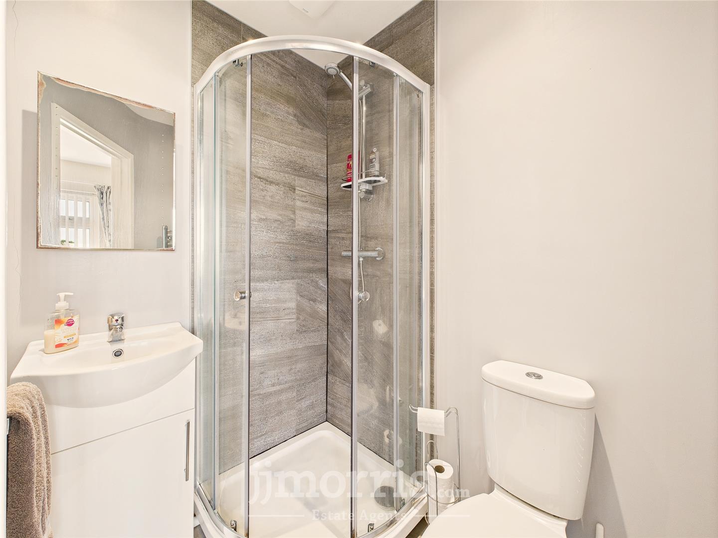 En-Suite - Wash basin with vanity unit below, W.C, shower, heated towel rail