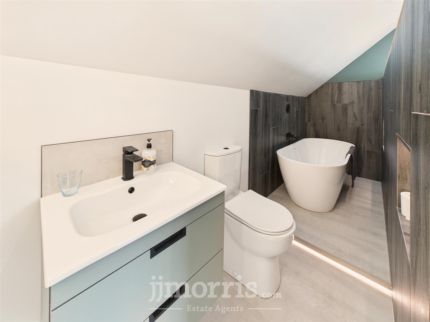 Ensuite - Low flush WC, vanity unit with hand wash basin, bath, part tiled walls, tiled flooring, heated towel rail.