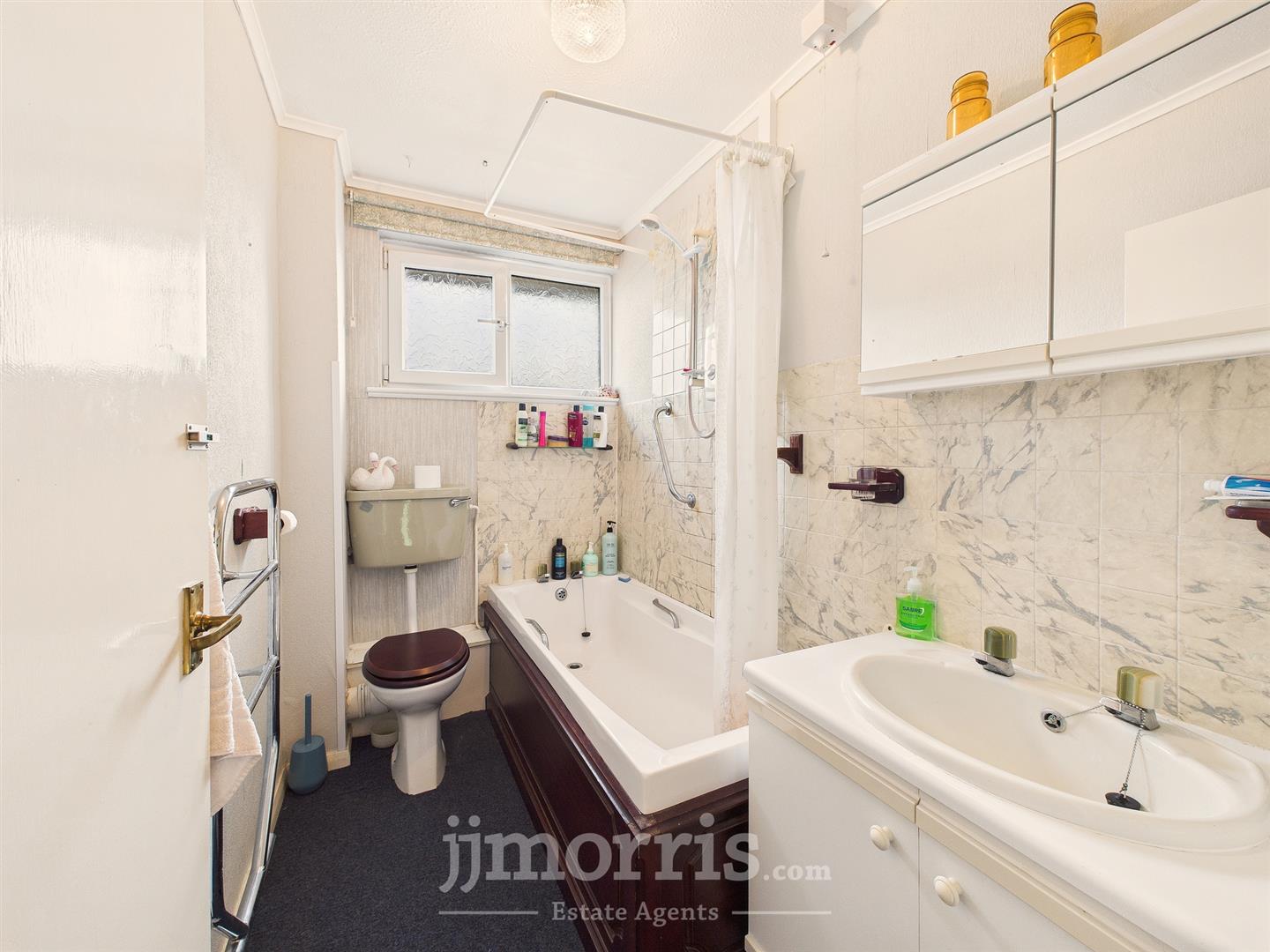 Bathroom - Low flush WC, vanity unit and hand wash basin, bath with electric shower over, extractor fan, heated towel rail, part tiled walls, coved ceiling, uPVC double glazed window.