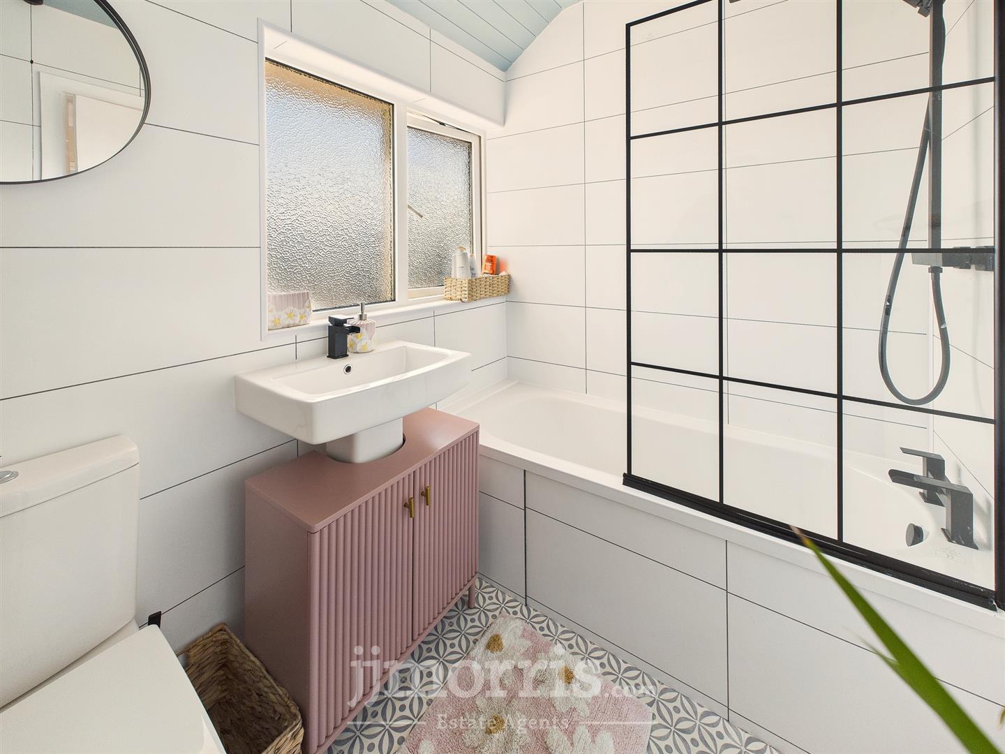 Bathroom - Low flush WC, pedestal hand wash basin, bath with fitted shower over, extractor fan, wooden panel ceiling, part wooden panel walls, part tiled walls, tiled flooring, spotlights, uPVC double glazed window.