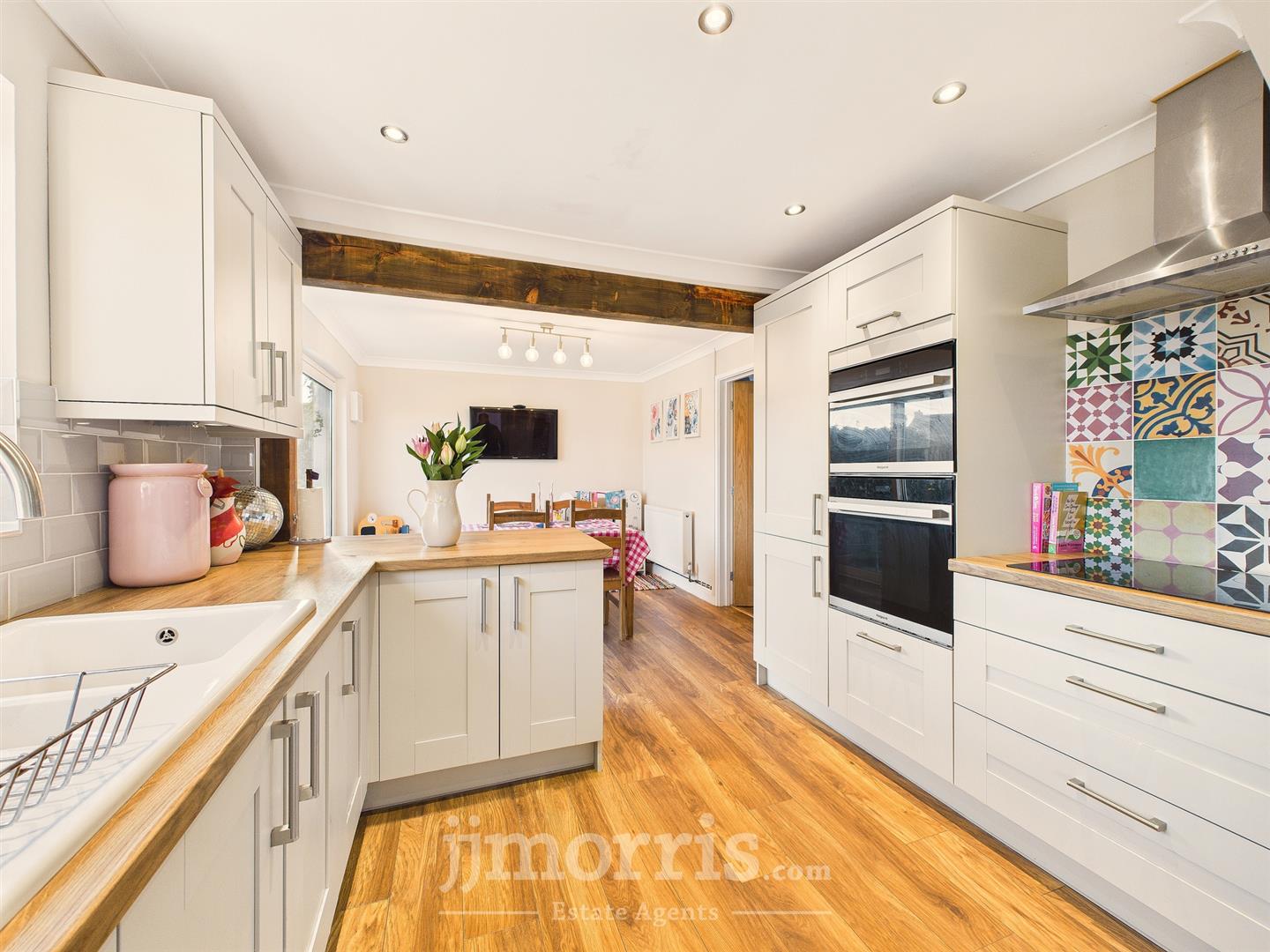 Kitchen/Dining Room - Having a range of wall and base units with complimentary worktop surfaces, inset 1.5 sink and drainer unit, counter top hob with extractor fan over, integrated Hotpoint appliances, oven/grill, integrated fridge/freezer, spotlights, coved ceiling, radiator, part tiled walls, wood effect flooring, uPVC double glazed window, uPVC double glazed patio doors, door to:-