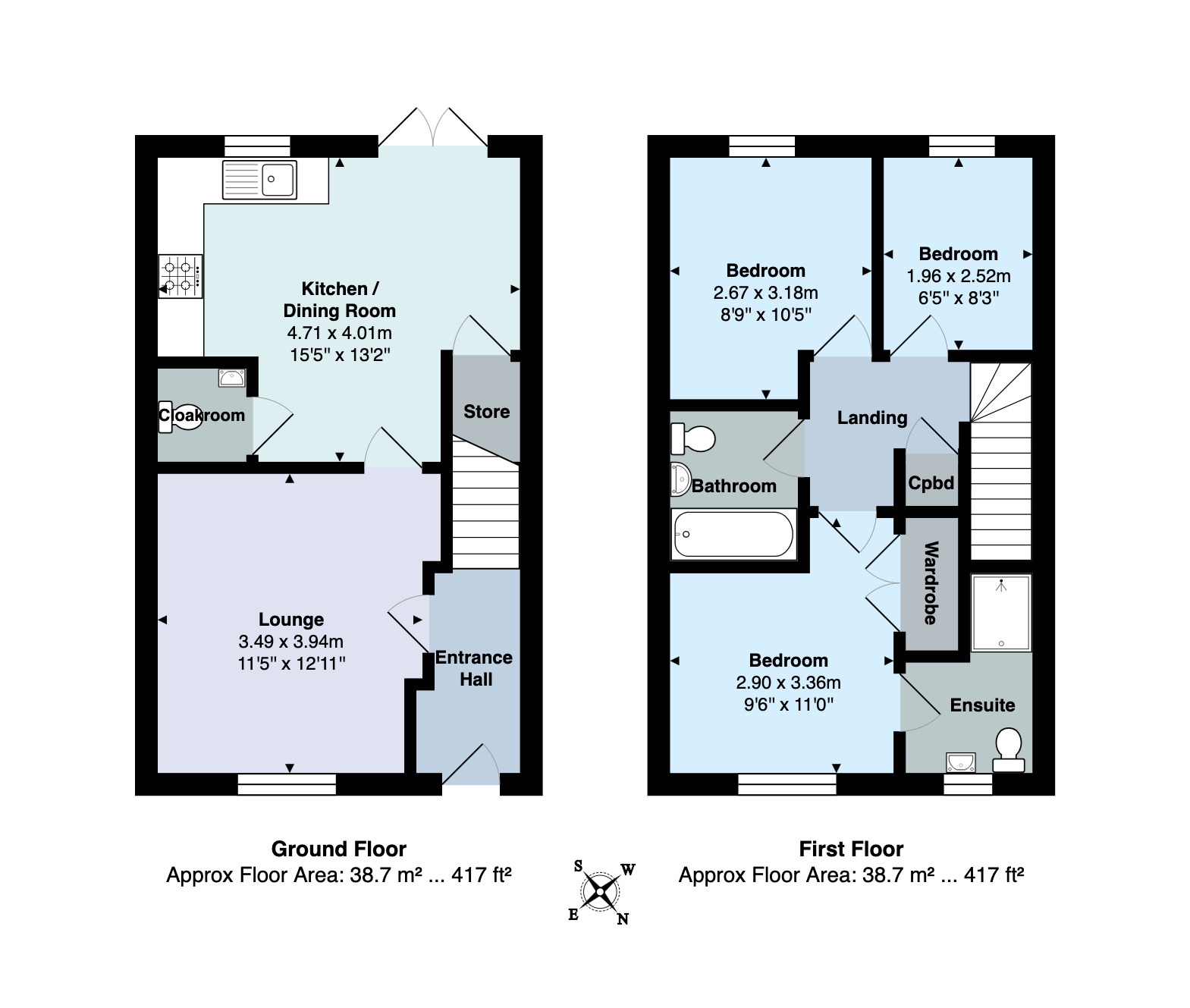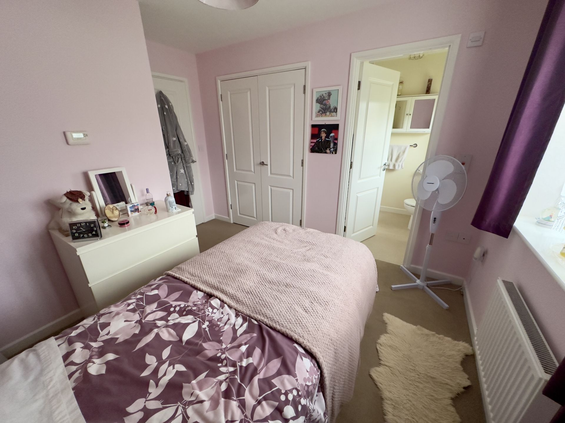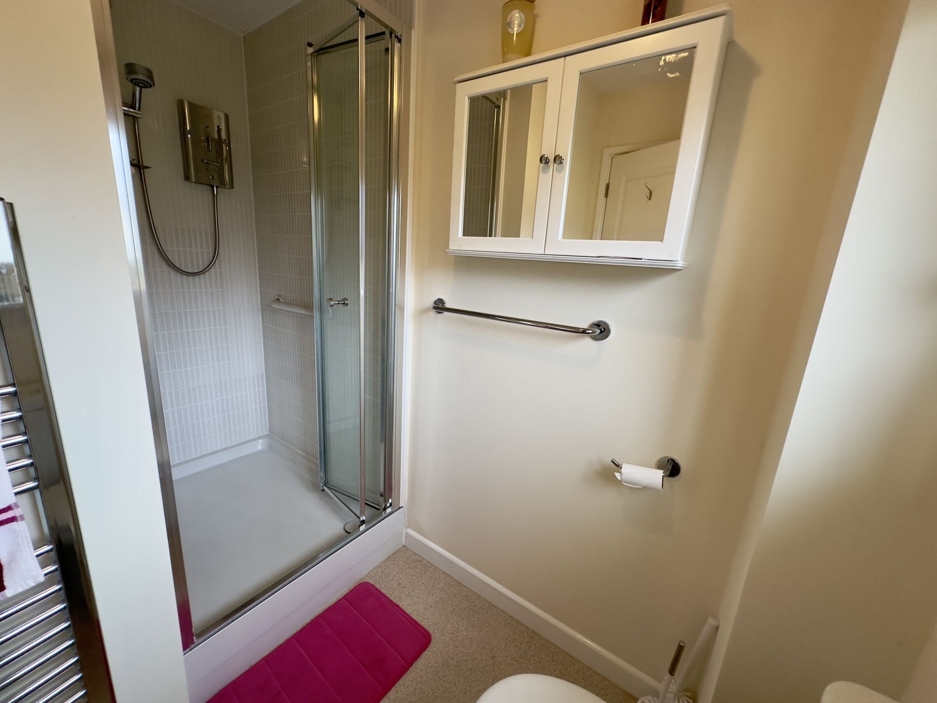 EN SUITE SHOWER: uPVC obscure double-glazed window to the front, close coupled WC, pedestal wash hand basin with mixer taps. Walk in tiled enclosure with electric shower over, heated towel rail, shaver point and extractor fan.