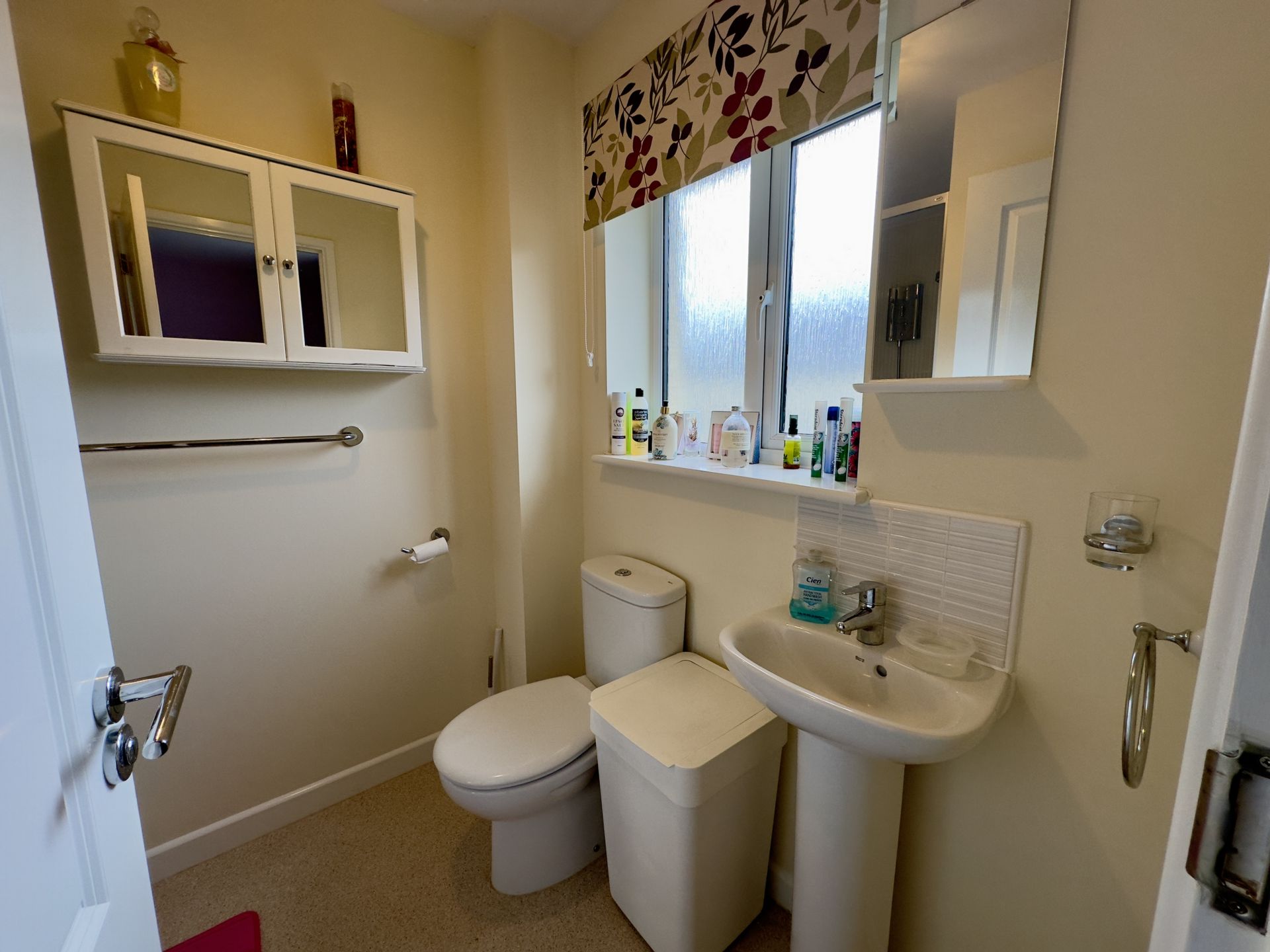 CLOAKROOM: Pedestal wash hand basin with mixer tap and tiled splashback, close coupled WC, radiator and extractor.