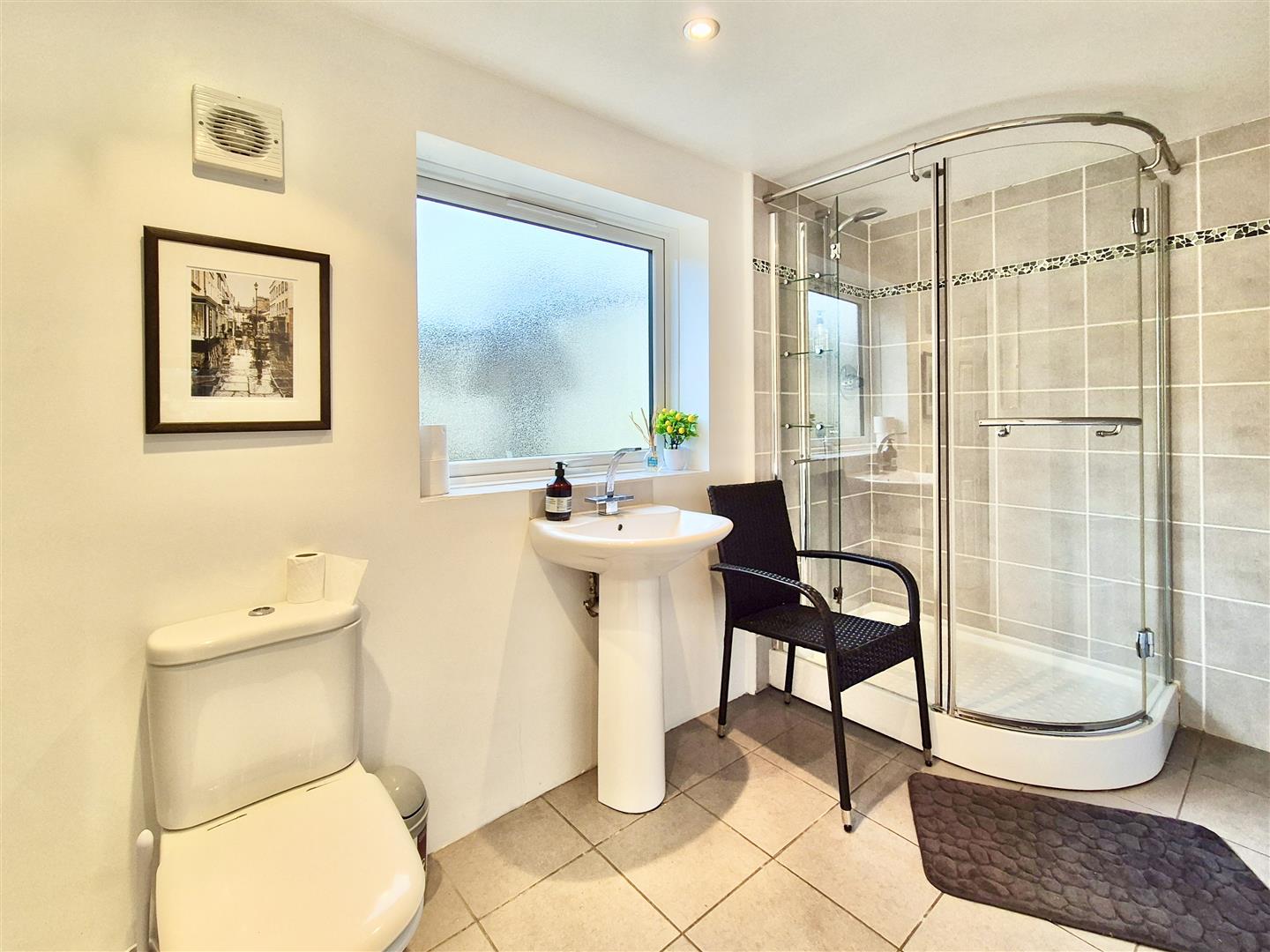 En-Suite - Comprising a shower cubical, close couple w.c. pedestal wash basin and having a built in cupboard.