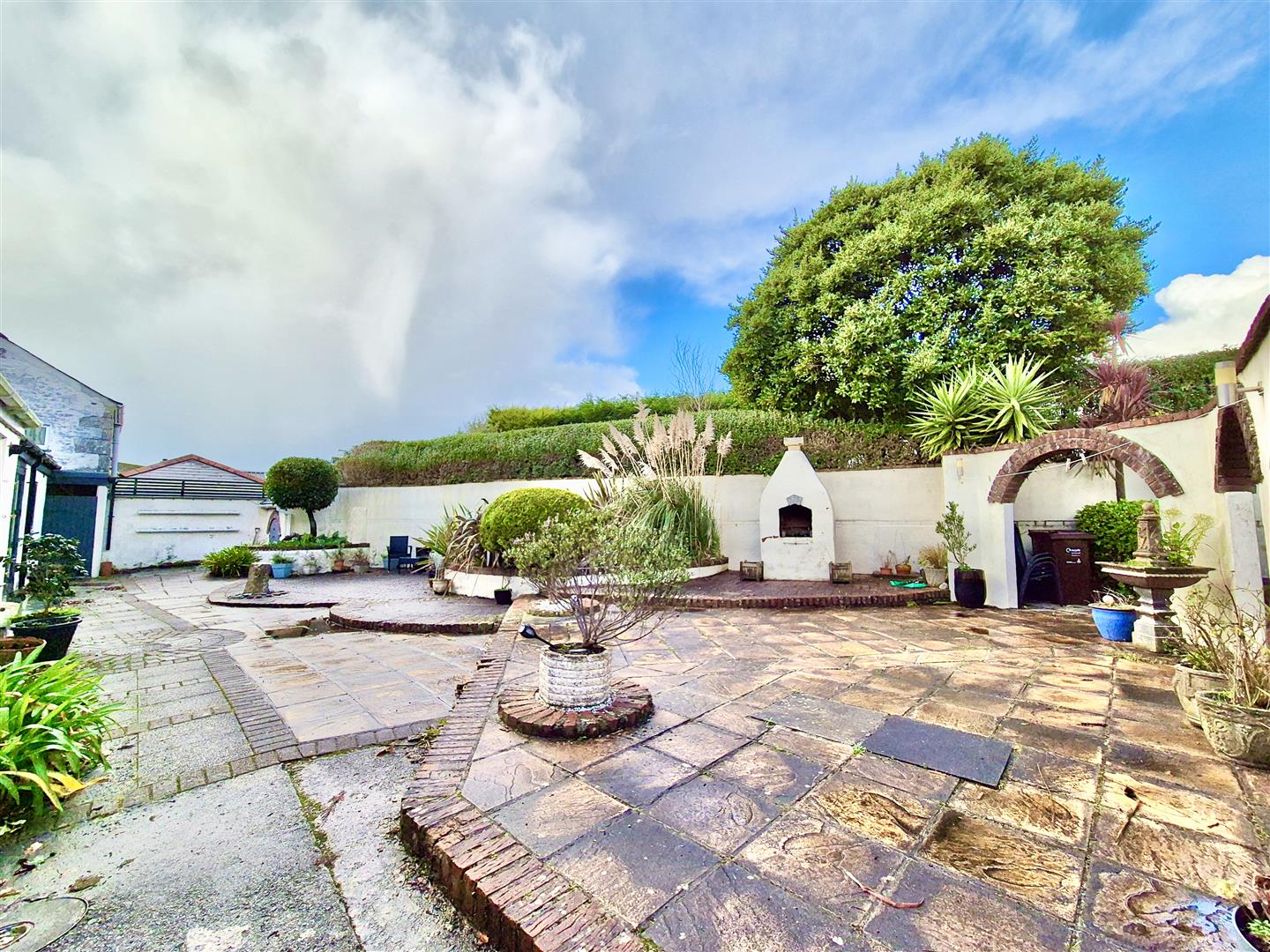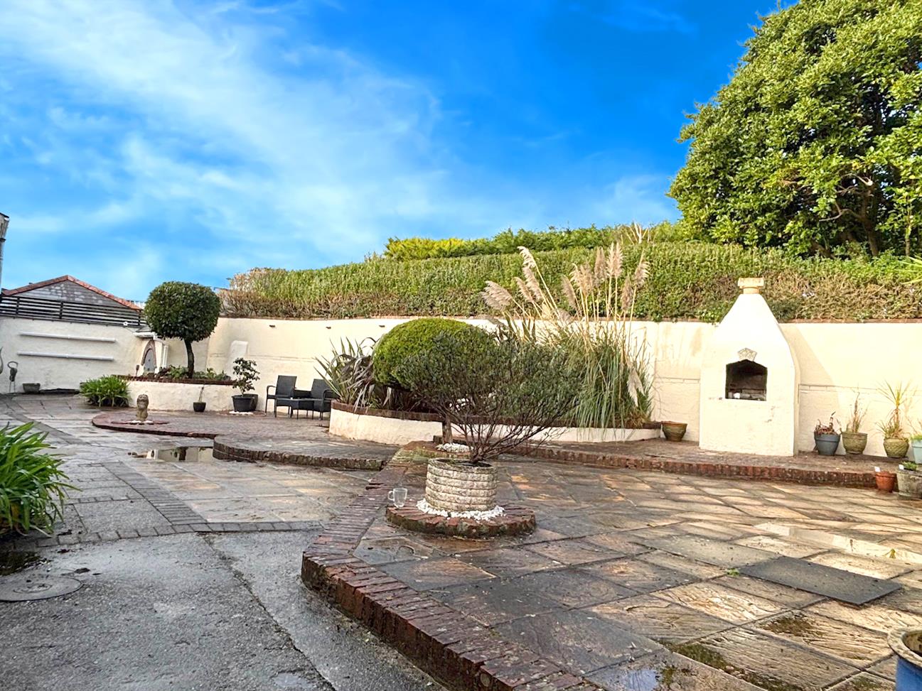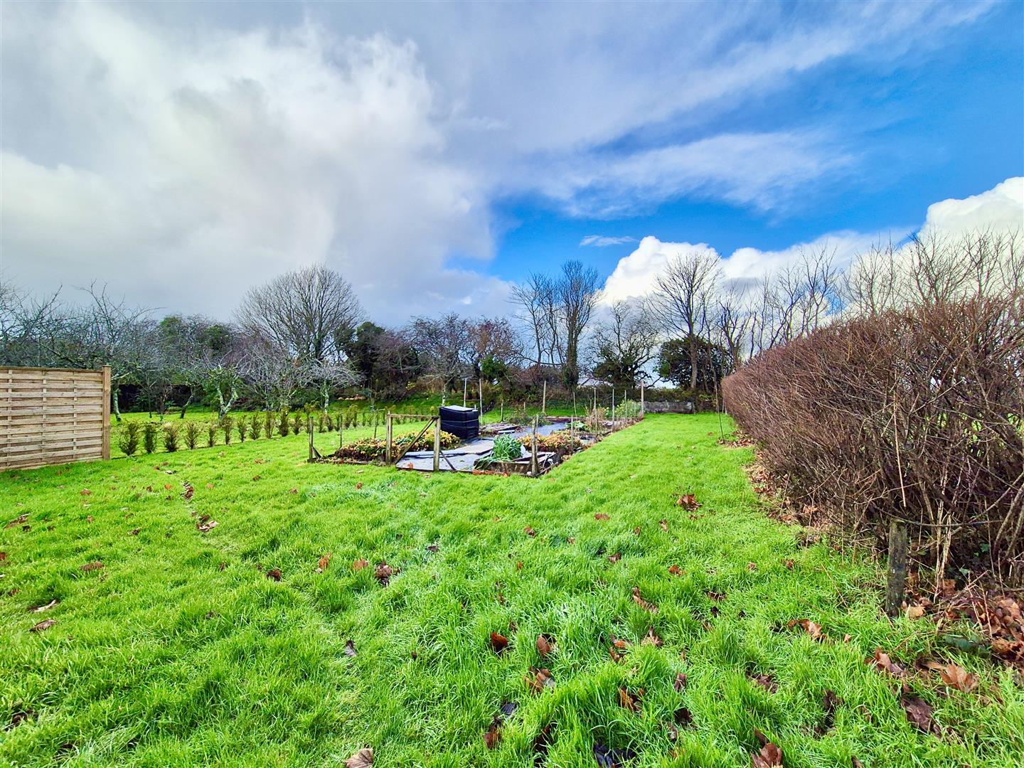 Outside - The outside space is a real feature of the property with the grounds totaling approximately 1.5 acres. The grounds comprise of good size lawned areas, woodland area, meadow, mediterranean style courtyard, large parking area and outbuildings, well established vegetable plot.