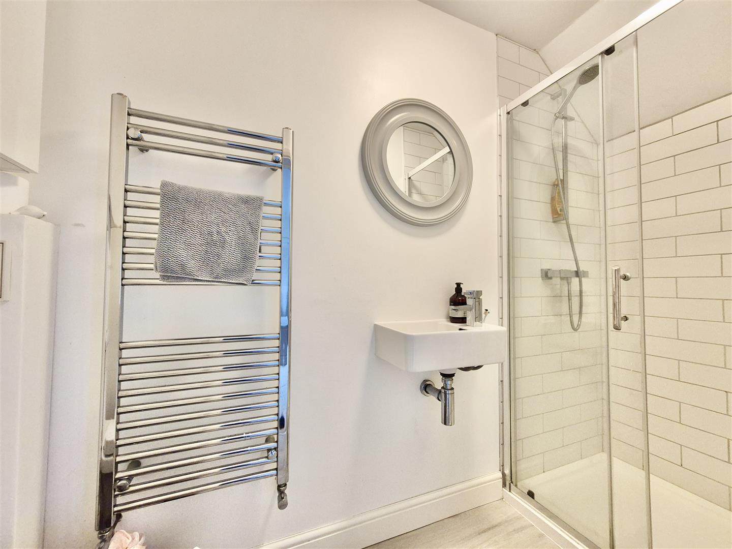 Shower Room - Comprising shower cubicle, pedestal wash hand basin with mixer tap over and a close coupled W.C. There is a frosted window to the rear, tiled floor, heated towel rail and built-in cupboard housing a water tank with immersion heater.