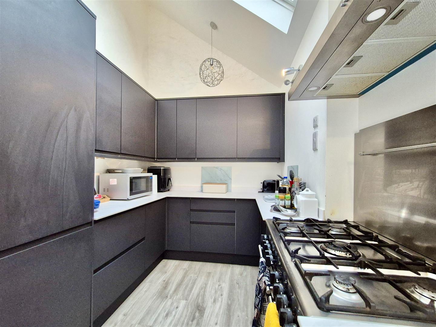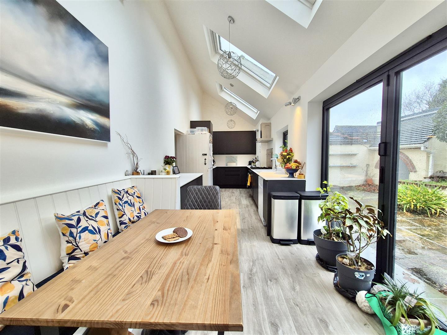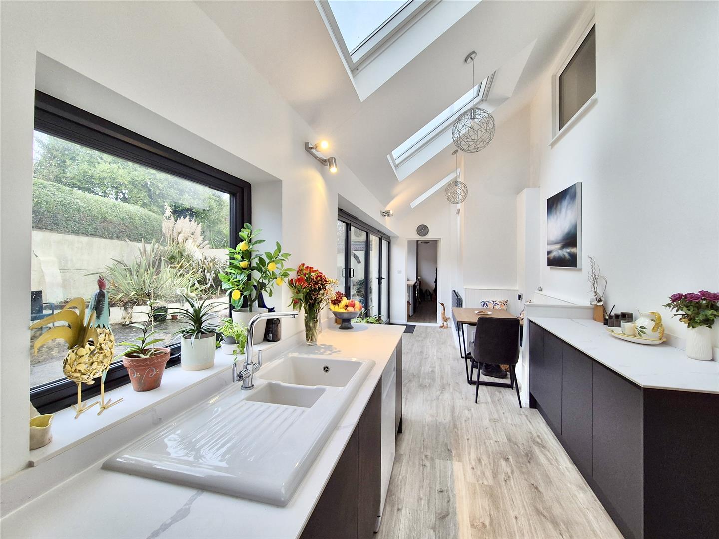 Kitchen - 9.37m x 7.85m x 2.21m (narrowing to 1.30m) (30'9" - Comprising working top surfaces incorporating a one and a half bowl ceramic sink unit with drainer and mixer tap over, cupboards and drawers under and wall cupboards over. There is space for a Range style stove, dishwasher and fridge freezer. The room has skylights and bifold doors opening onto the courtyard. Door to
