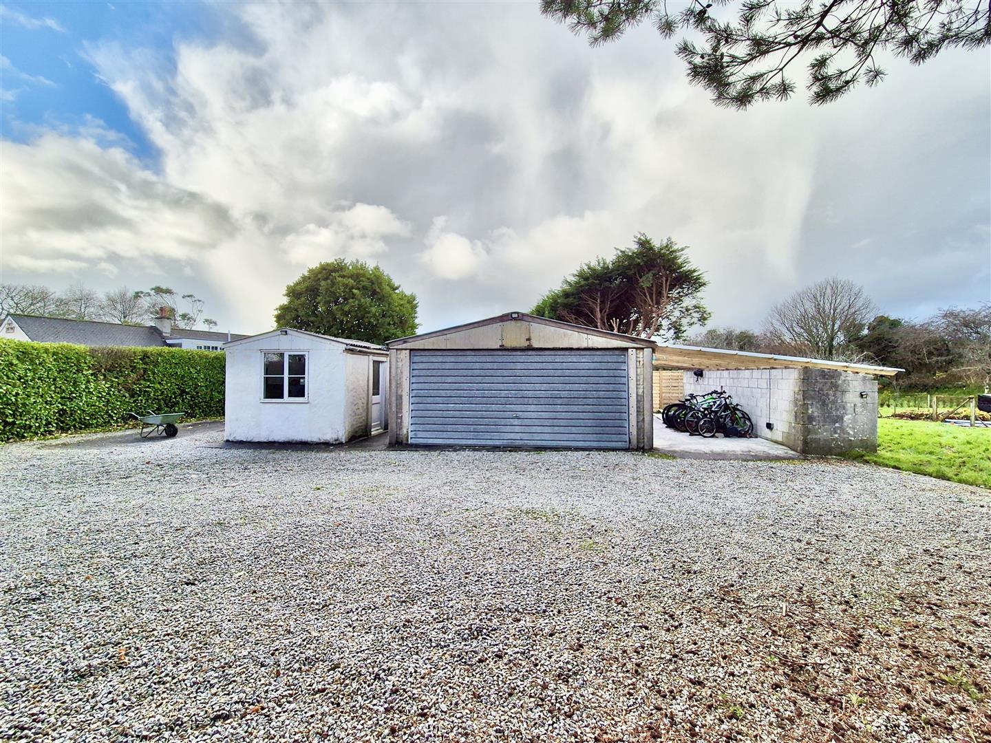 Detached Garage - A large garage area with up and over door and covered car port to the side.
