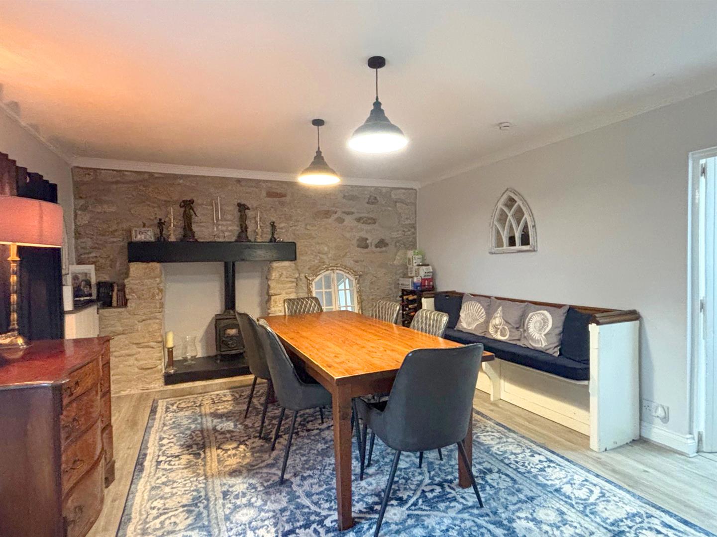 Dining Room - 4.50m x 3.81m (14'9" x 12'6") - With outlook to the front and having an exposed stone wall with fireplace once again acting as a focal point to the room with tiled hearth with mantle over and housing a wood burner which is not in working order.