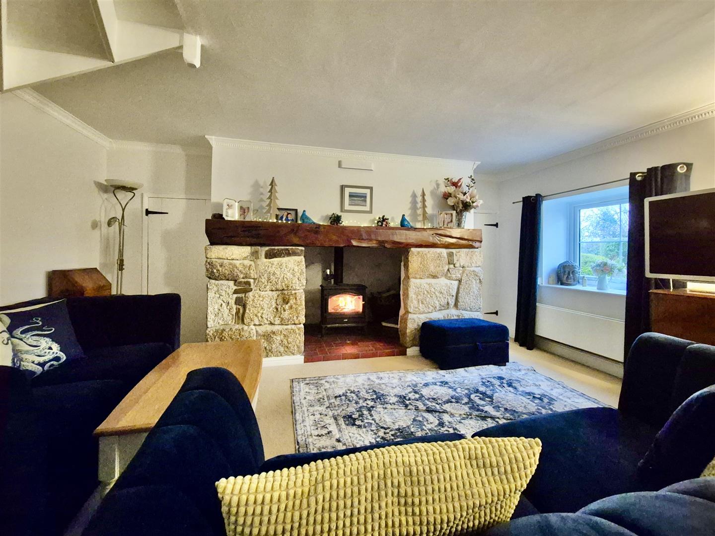 Lounge - 7.77m x 5.18m (narrowing to 3.81m) (25'6" x 17' (n - Having an impressive, imposing, inglenook fireplace acting as a focal point for the room with tiled hearth, local stone surround and wood mantle over housing a wood burner. To the side of the fireplace are built-in cupboards, there are stairs to the first floor and door to