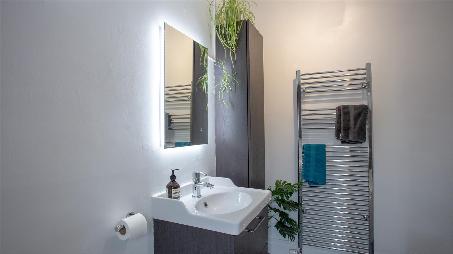 Bathroom - Tile effect flooring, heated towel rail, bath with shower over, toilet, wash basin with vanity unit, UPVC window with textured glass.