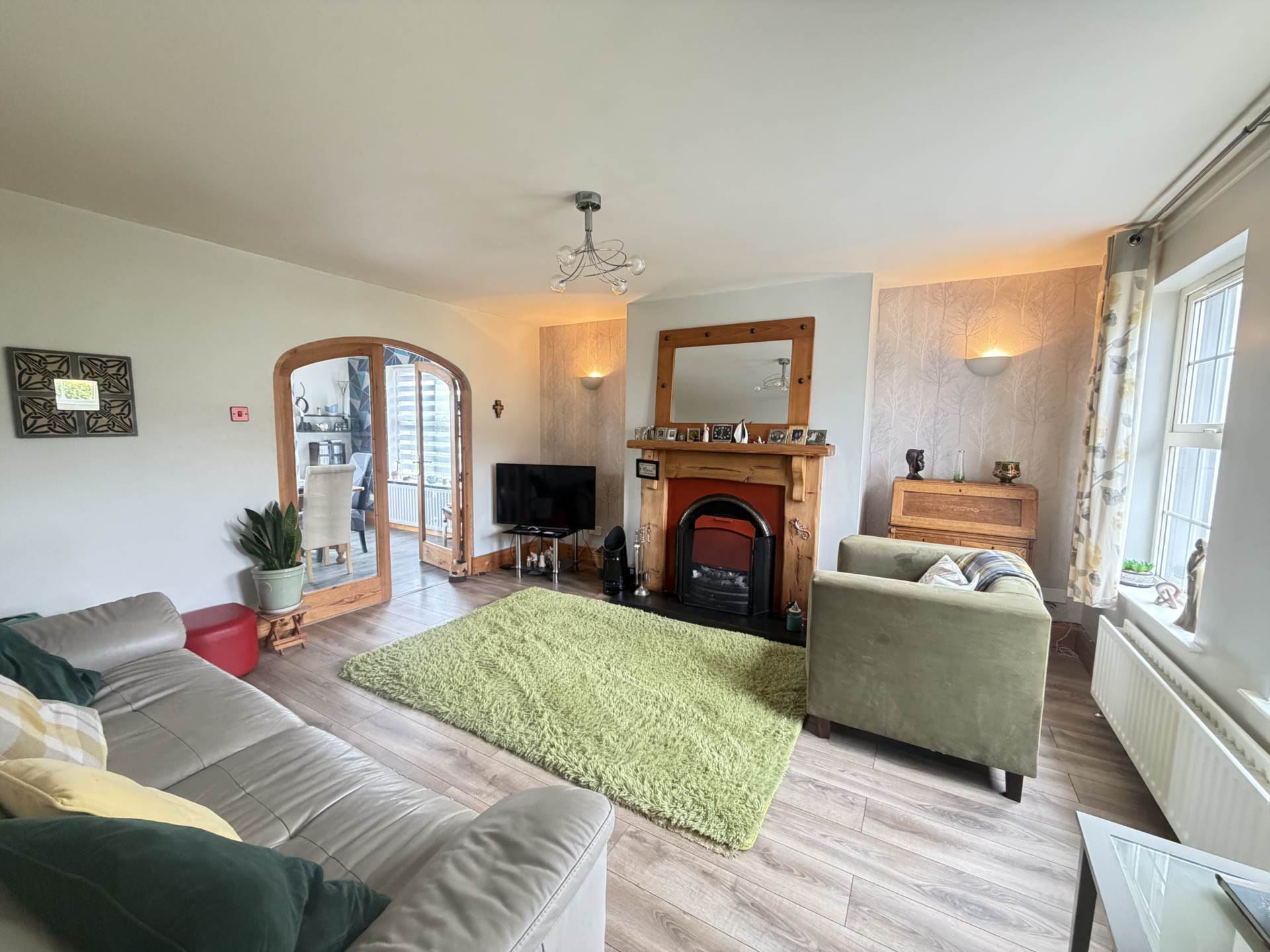 - Bright lounge with open fire and feature arch door way to kitchen