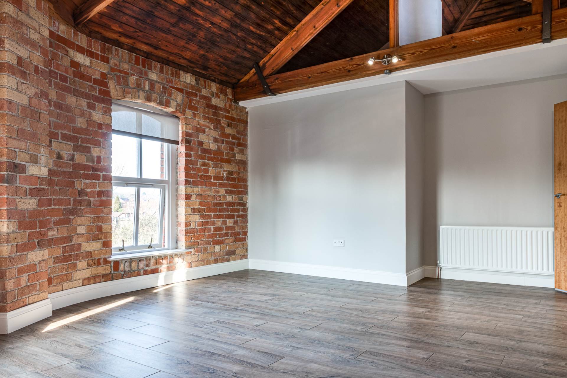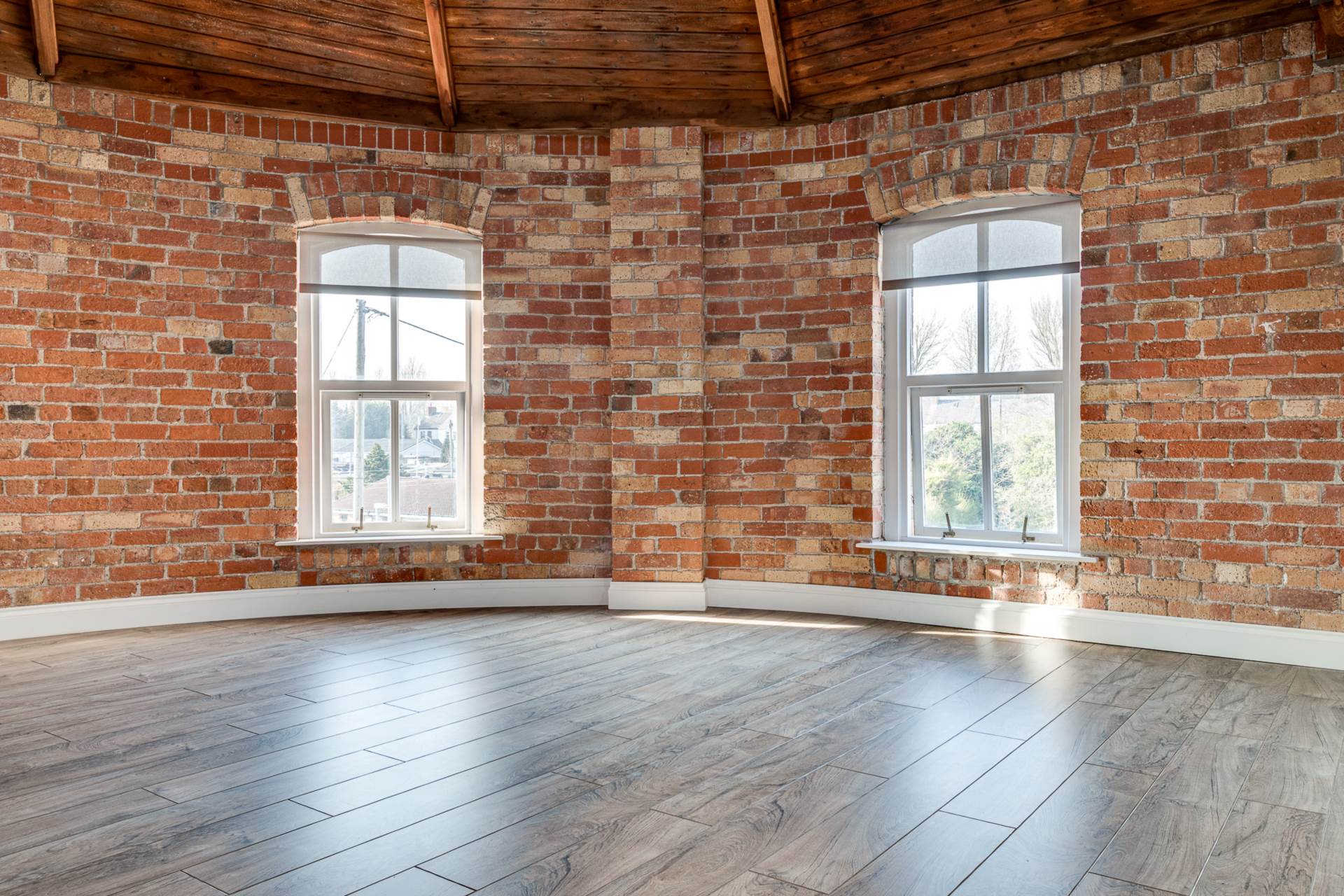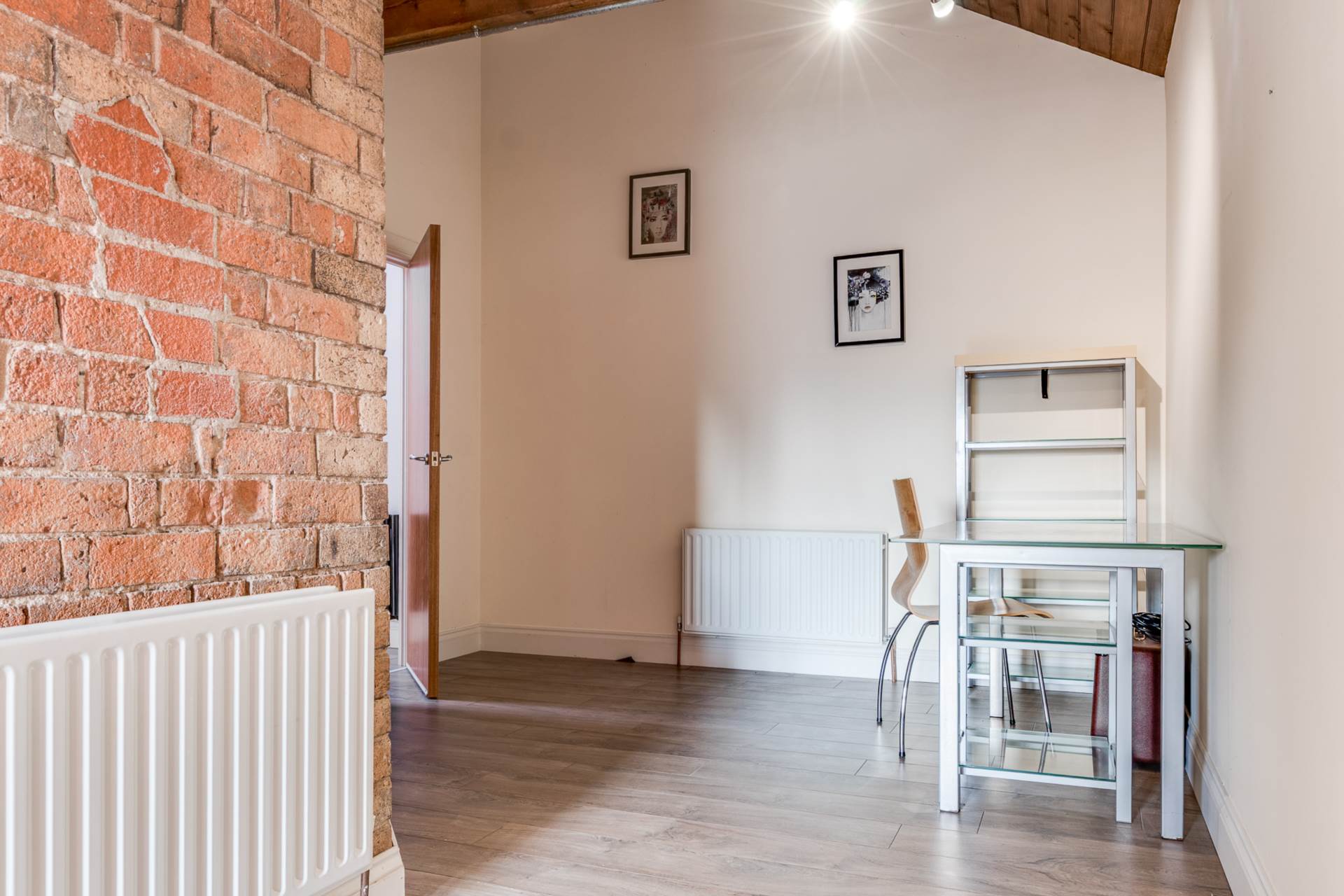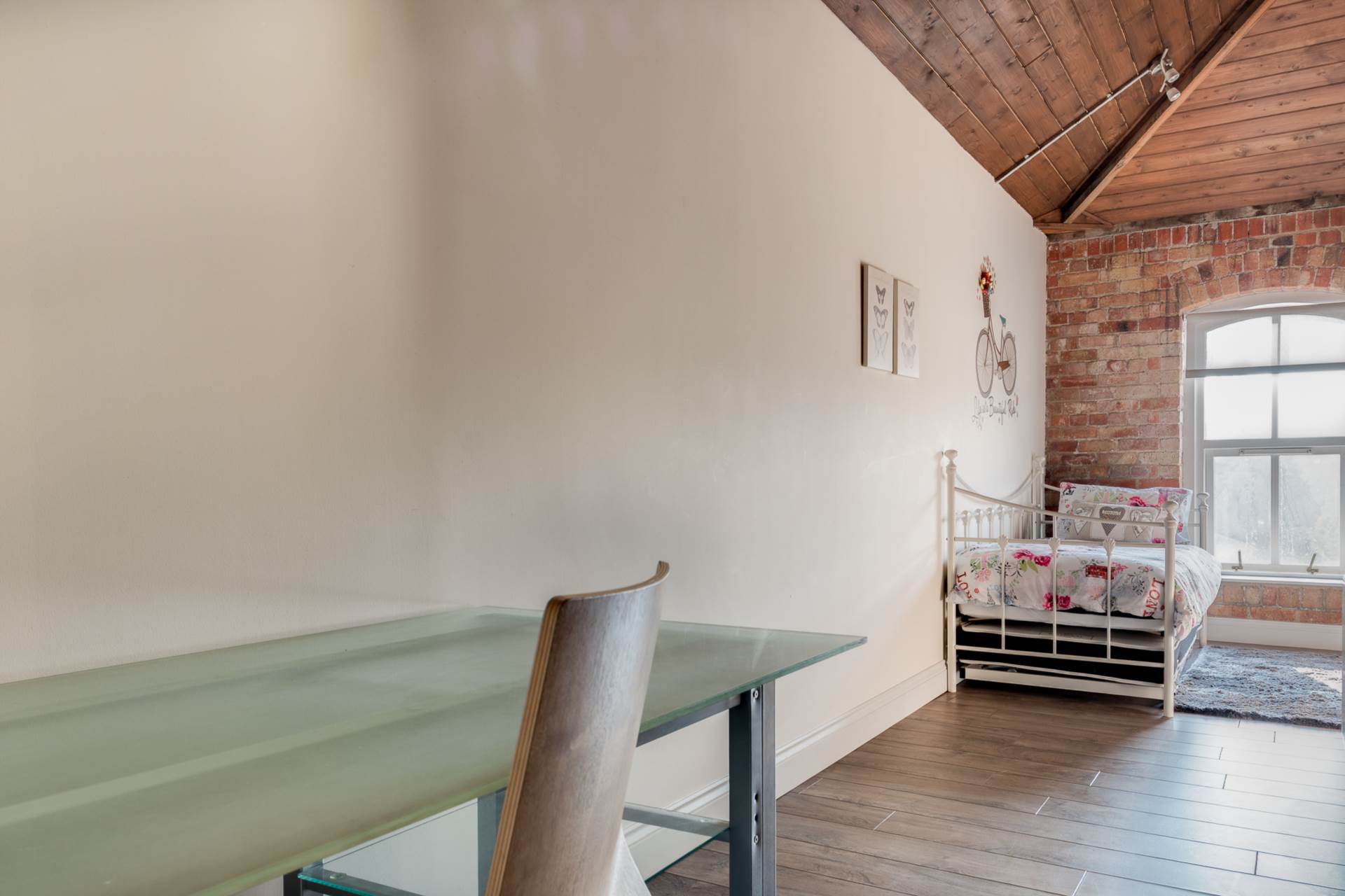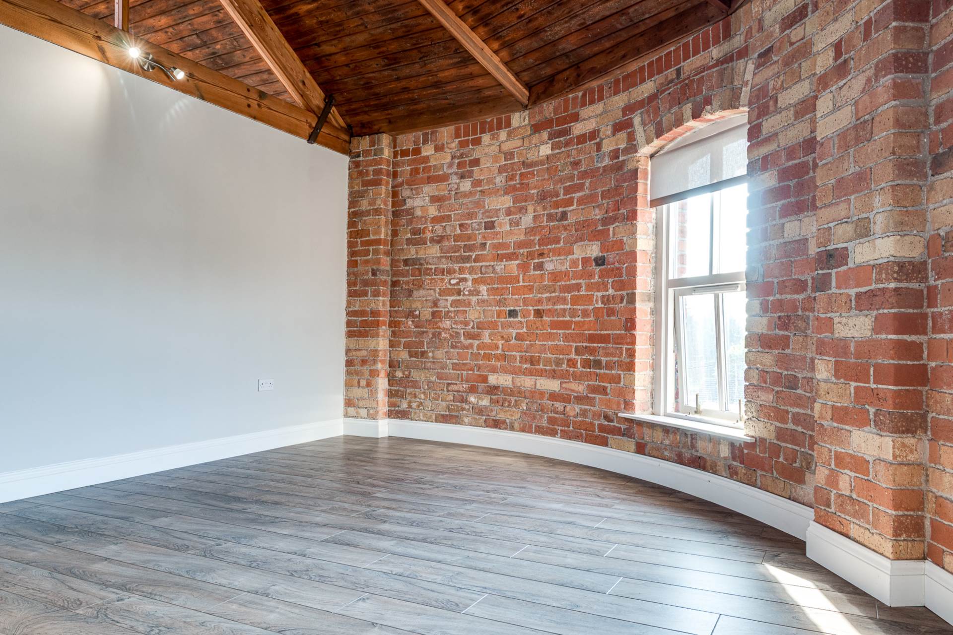Exposed brick wall. Timber clad ceiling.