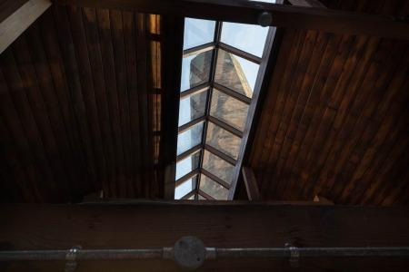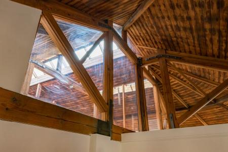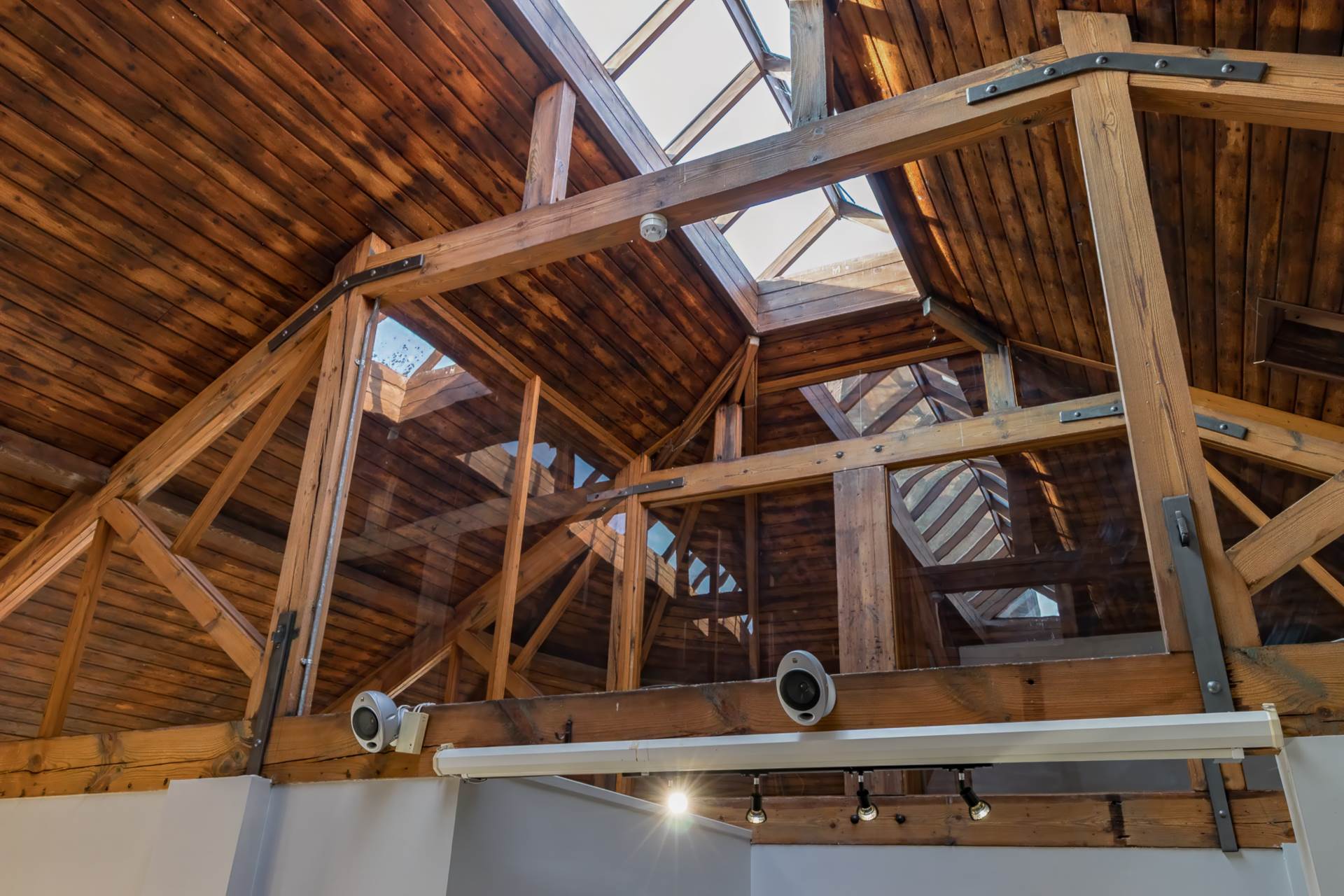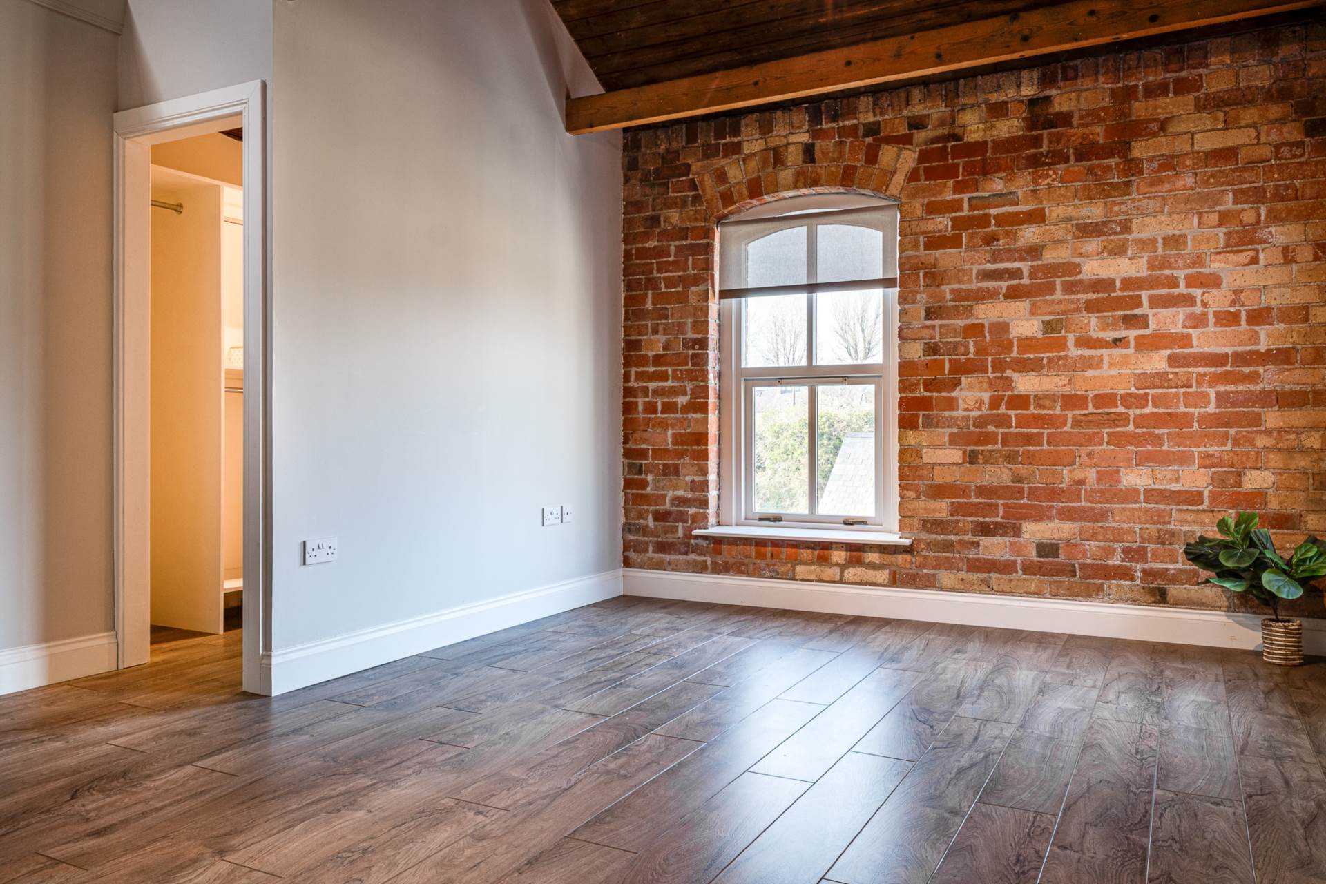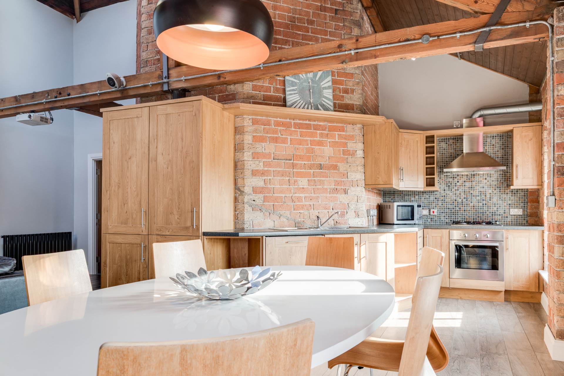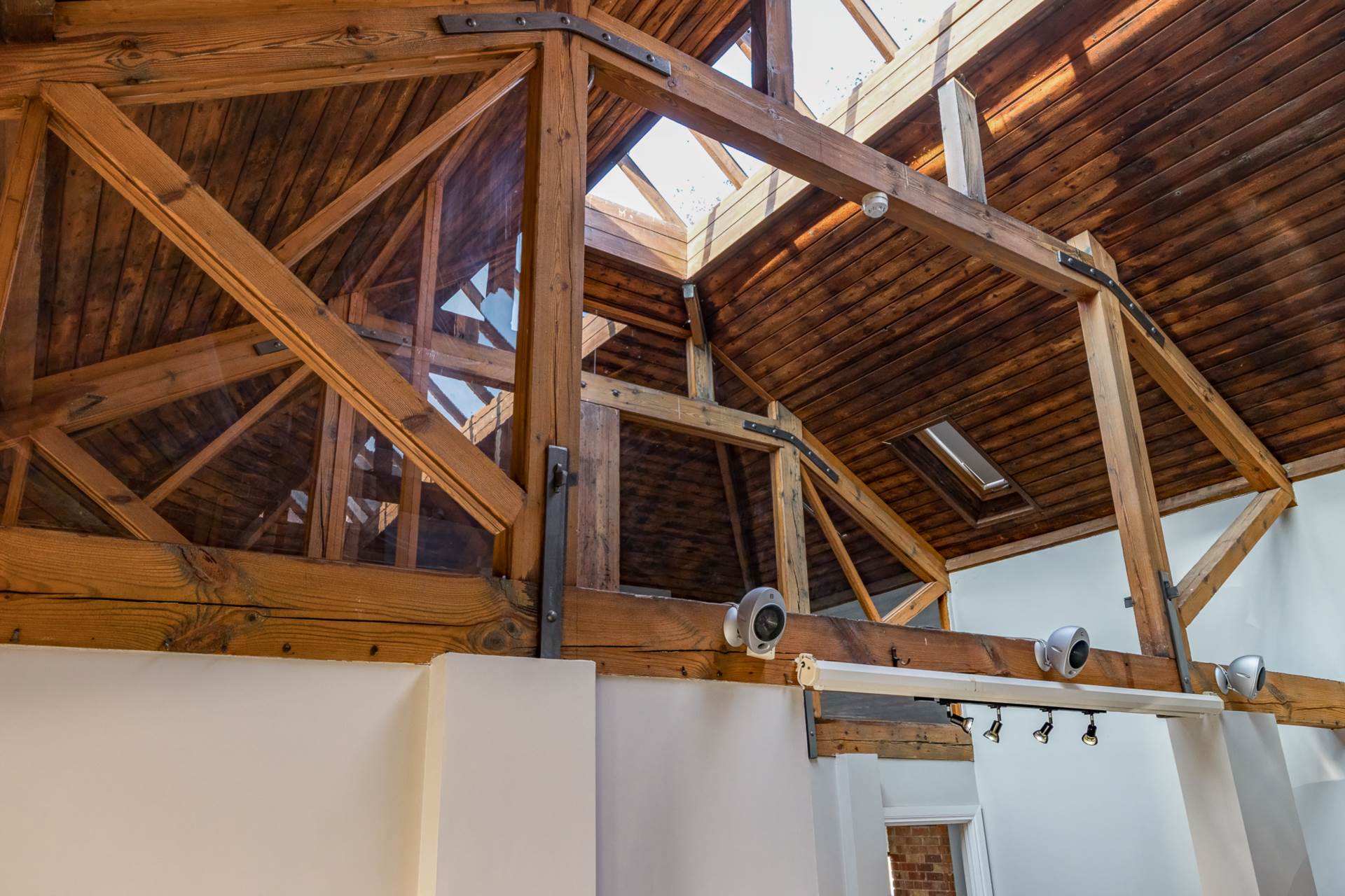 Exposed brick wall. Timber clad ceiling.