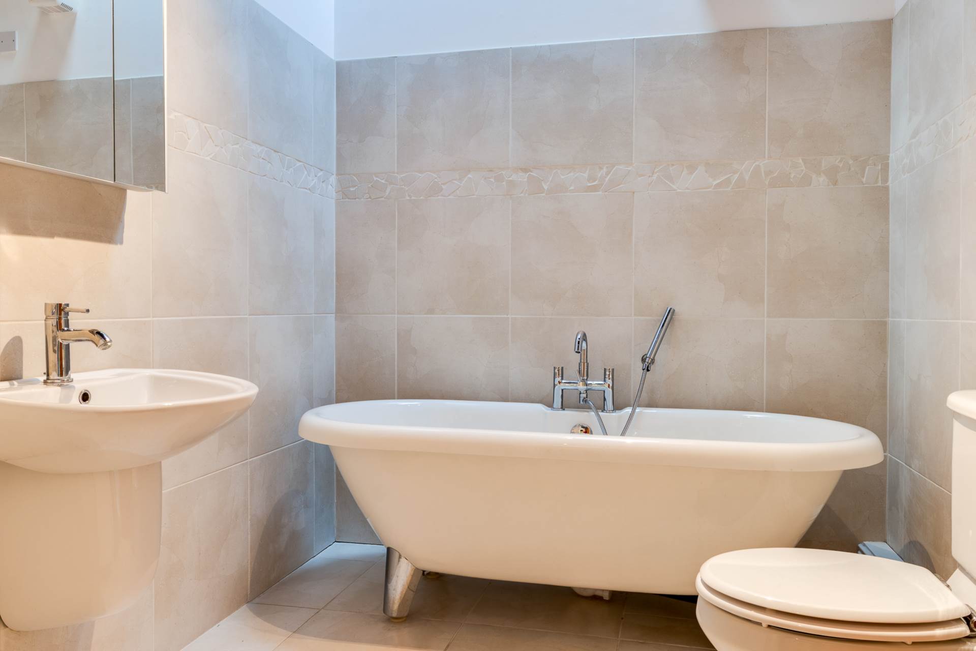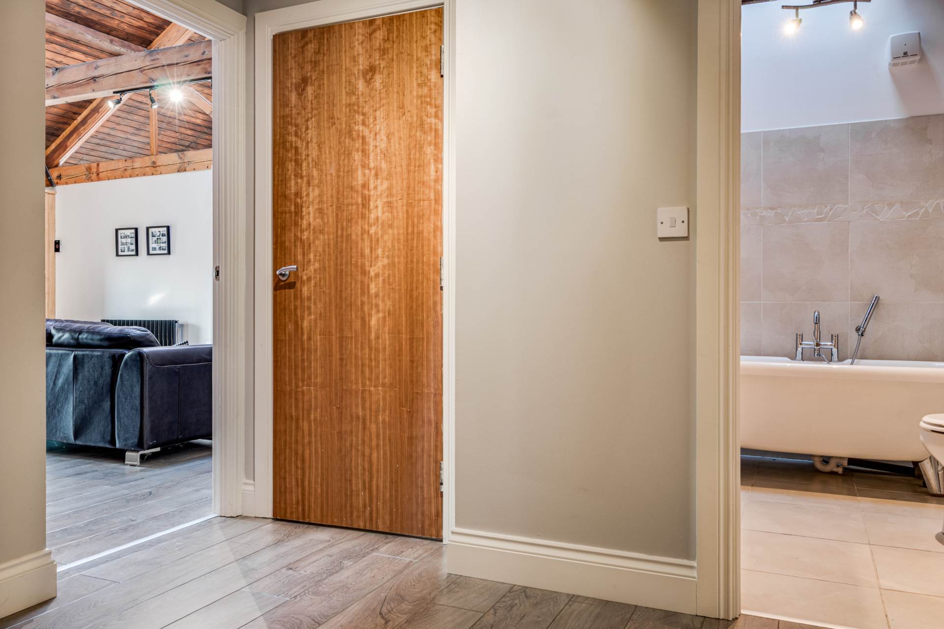 Lavish white suite comprising rolltop bath tub with chrome mixer tap and telephone hand shower. Semi-ped wash hand basin. Low flush WC. Part tiled walls. Ceramic tile floor. Beamed and exposed timber clad ceiling. Velux window.