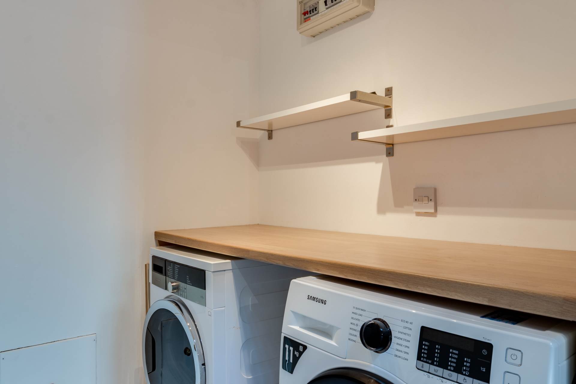Fitted worktop and shelving. High quality washing machine and separate tumble drier installed and included.