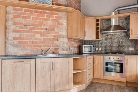 Extensive original timber beams and timber clad ceiling as well as exposed brick walls. Original mill chimney feature and glazed roof apex. Kitchen area with single drainer stainless steel sink unit and mixer tap with vegetable basin. Excellent range of built-in high and low-level Shaker style units and durable worktops. Stainless steel cooker canopy. Integrated dishwasher, and fridge freezer. Zanussi stainless steel low-level oven and four ring gas hob unit with mosaic splashback. Cupboard housing gas fired central heating boiler. Fitted black strip LED spotlighting throughout with contemporary dining area drop light. Bespoke black column radiators enhance the space.