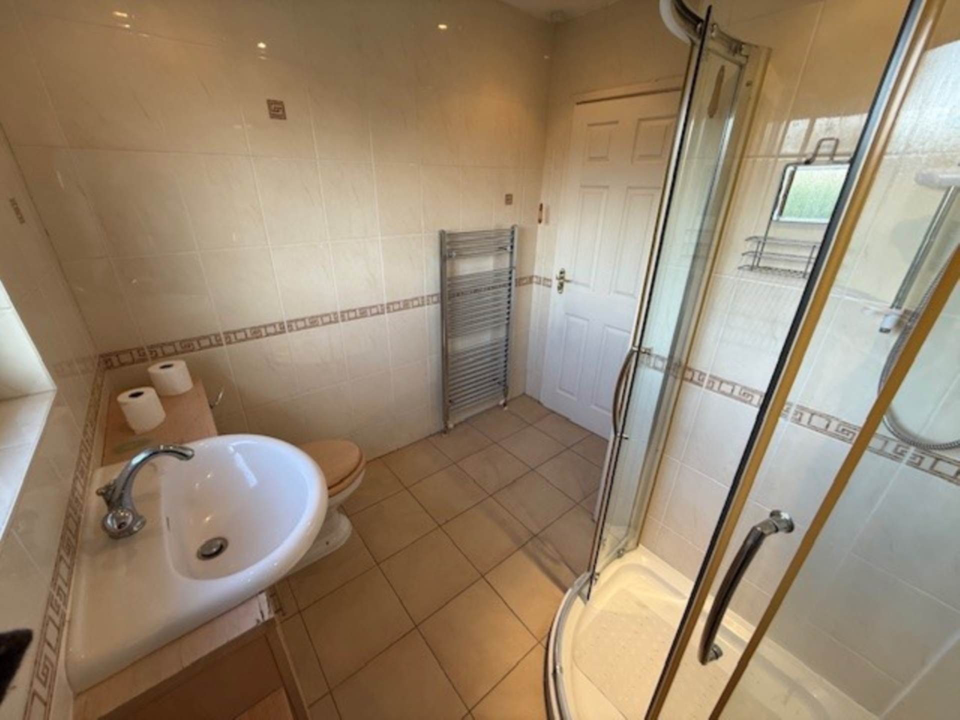 - Fully tiled family shower room with contemporary white suite