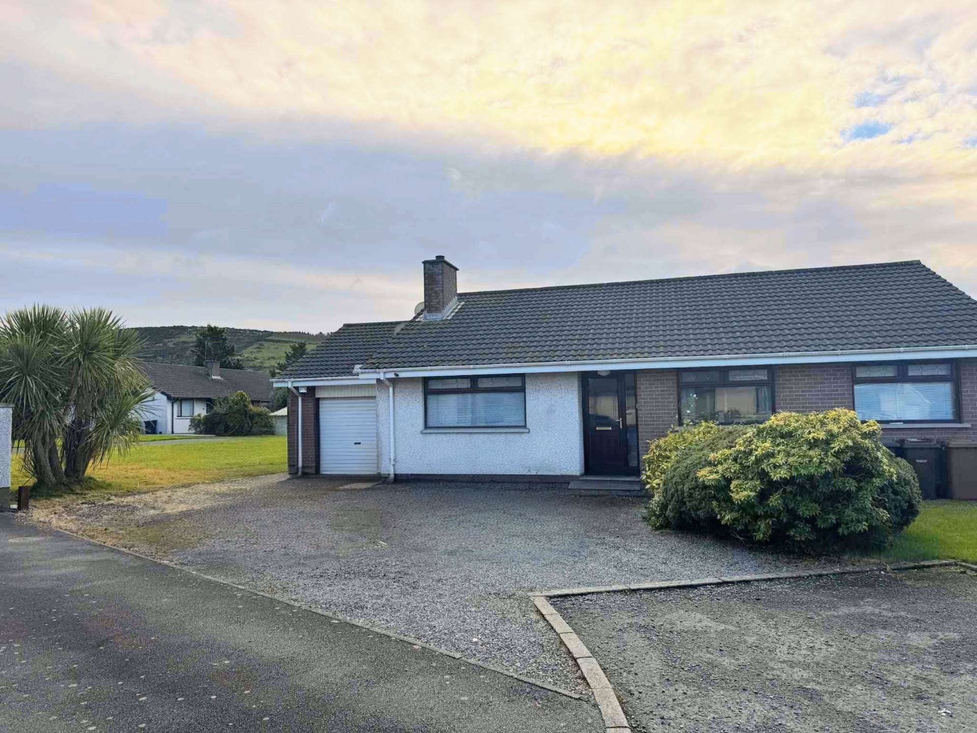 Gravelled driveway and ample parking space. Neat front garden in lawn with shrubs and bounded by wall. Safely enclosed paved rear garden with raised sun patio and coloured stoned area bounded by wall and fencing.