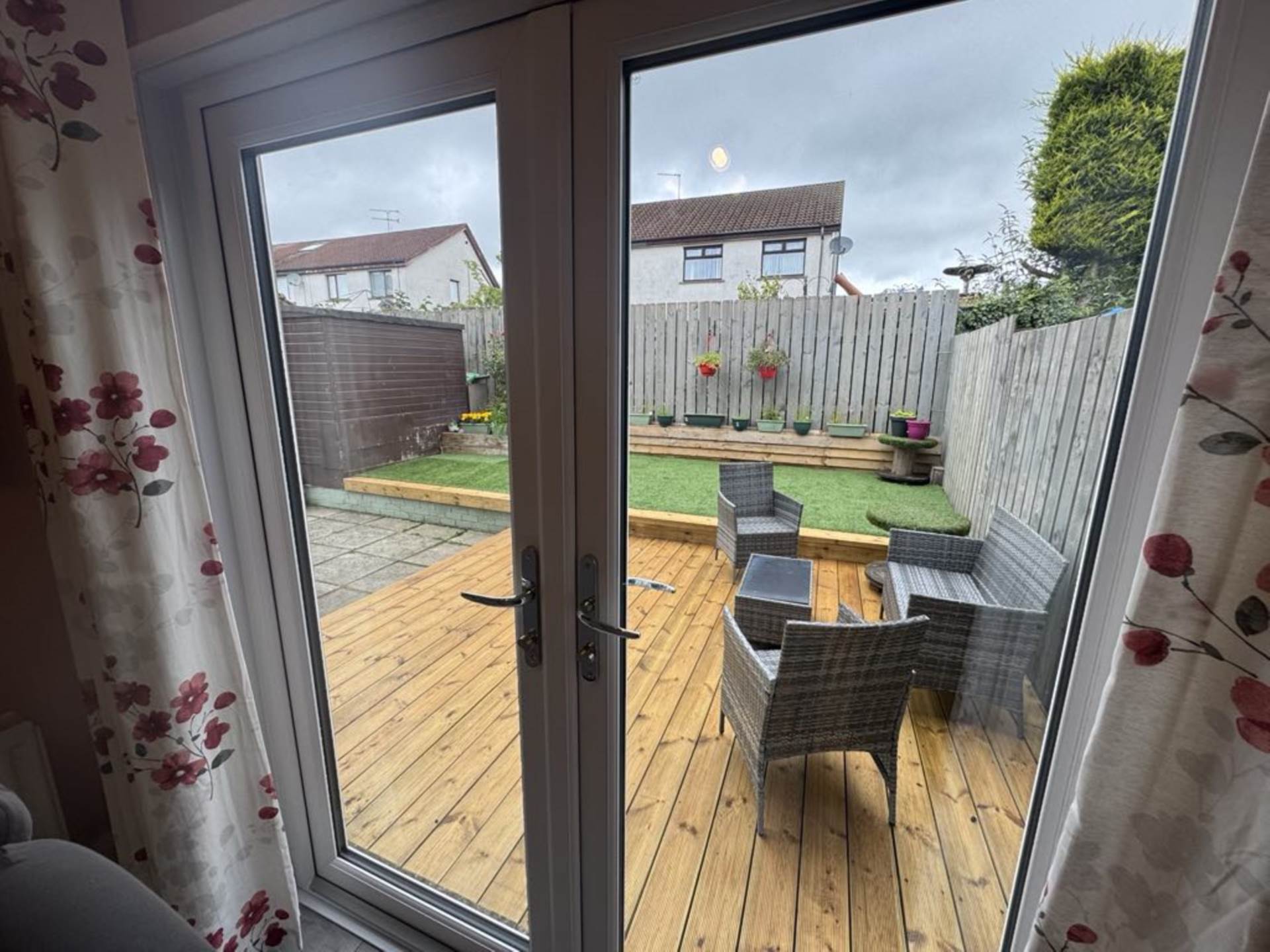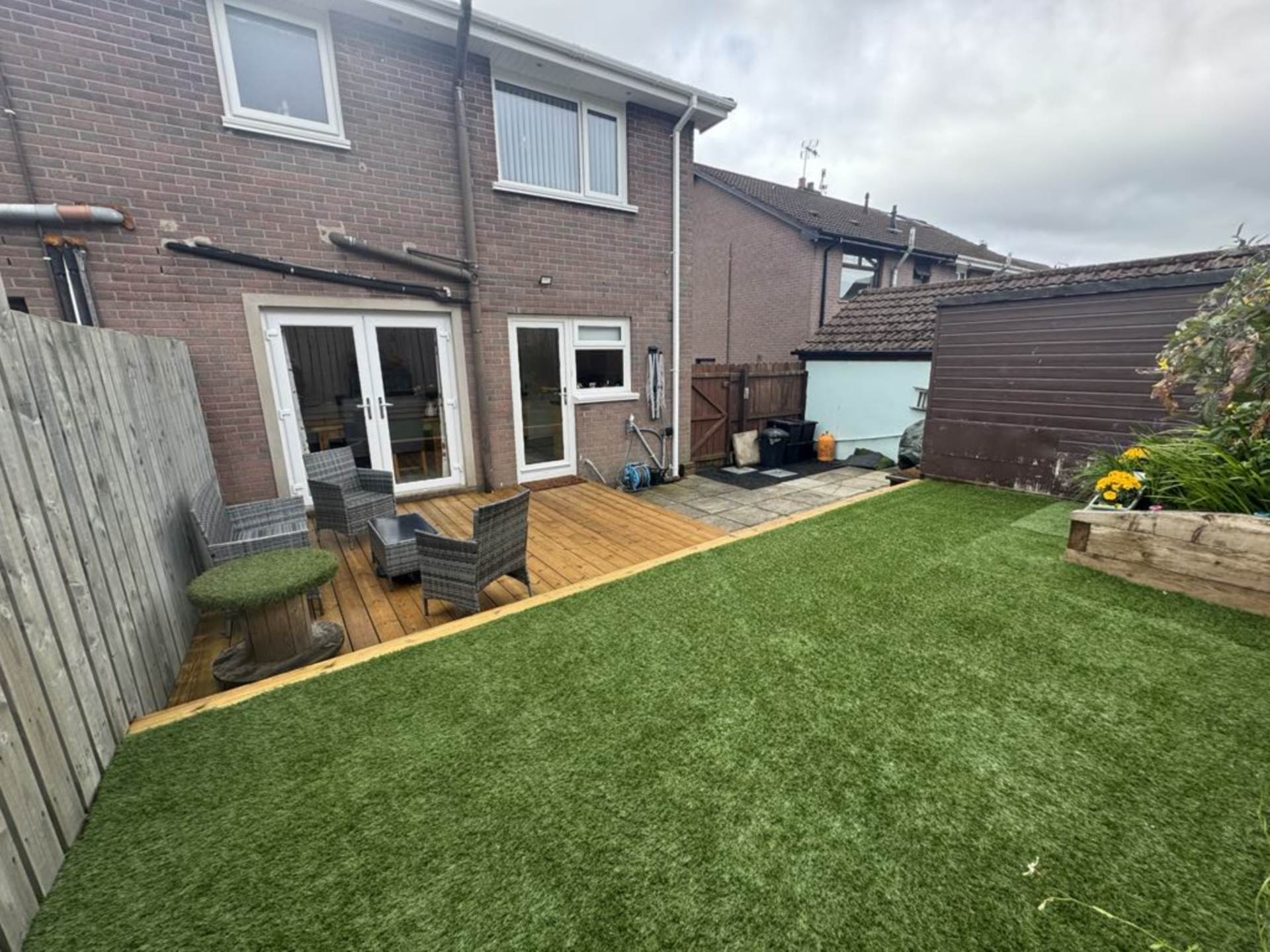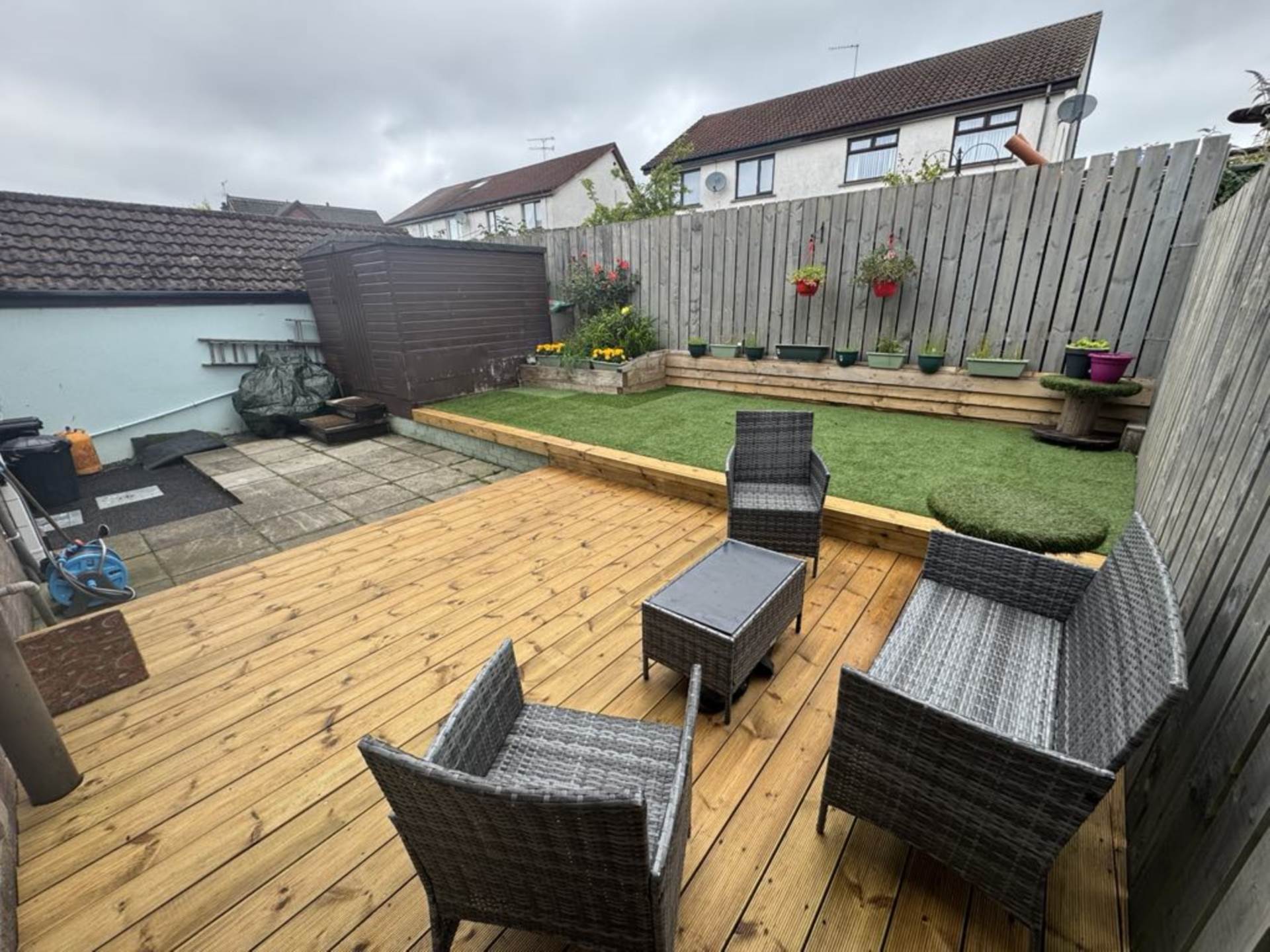 - Fully enclosed rear garden with sun deck, patio and and raised lawn area