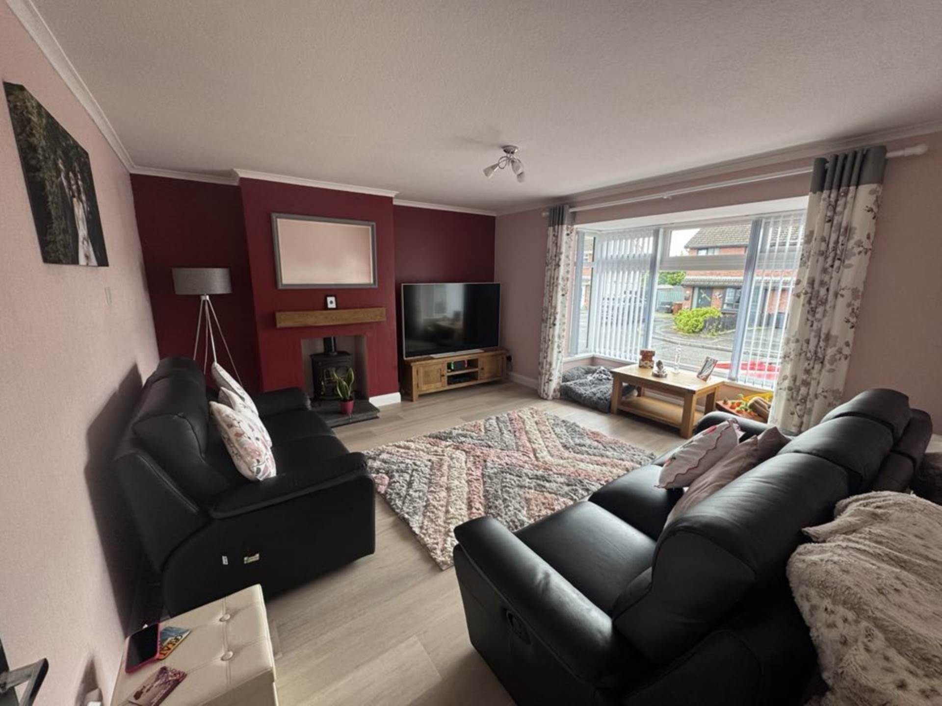 - Lounge with feature cast iron multi burning stove with wooden mantel