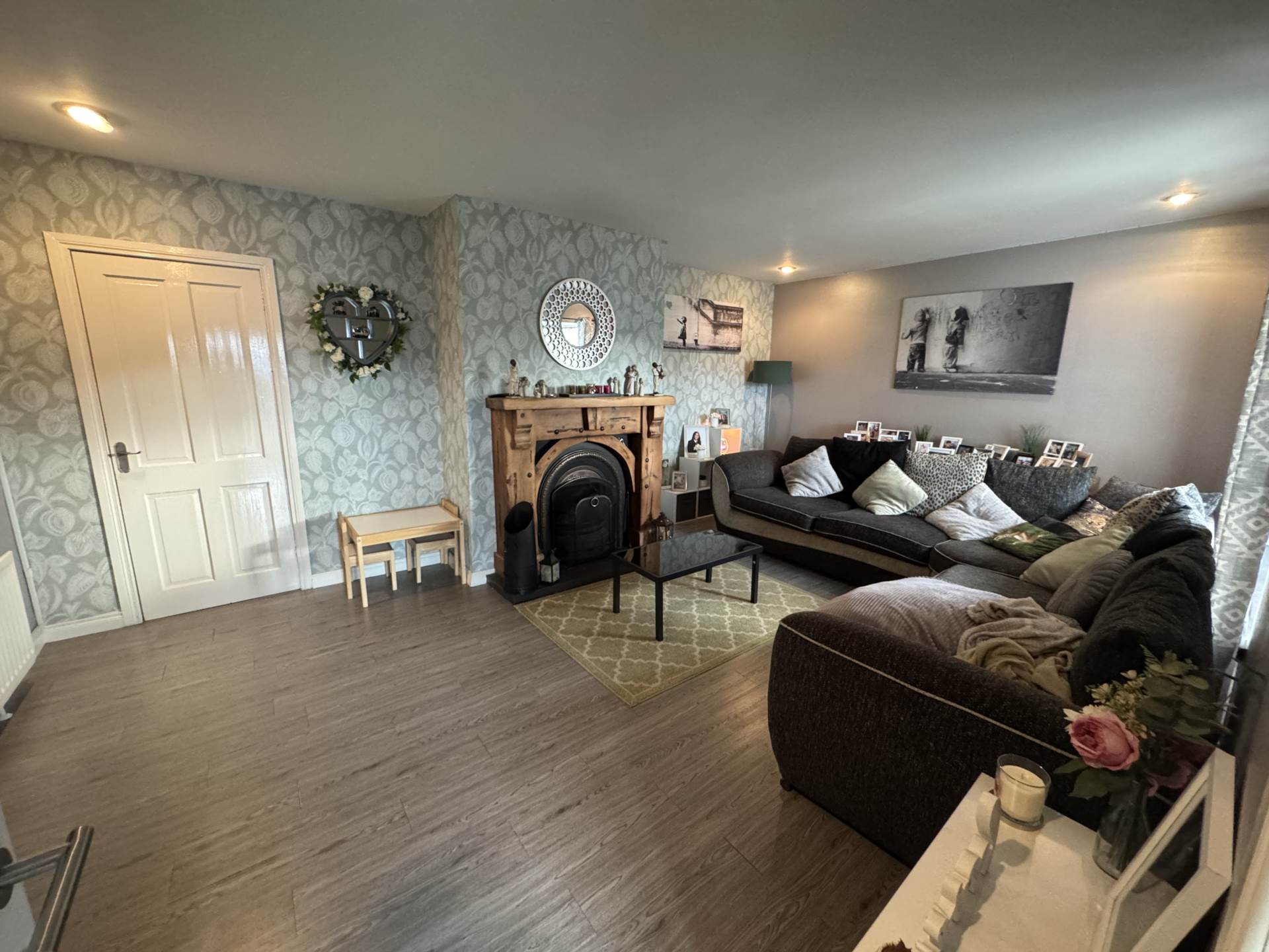 - Lounge with feature fireplace and wood strip laminate flooring
