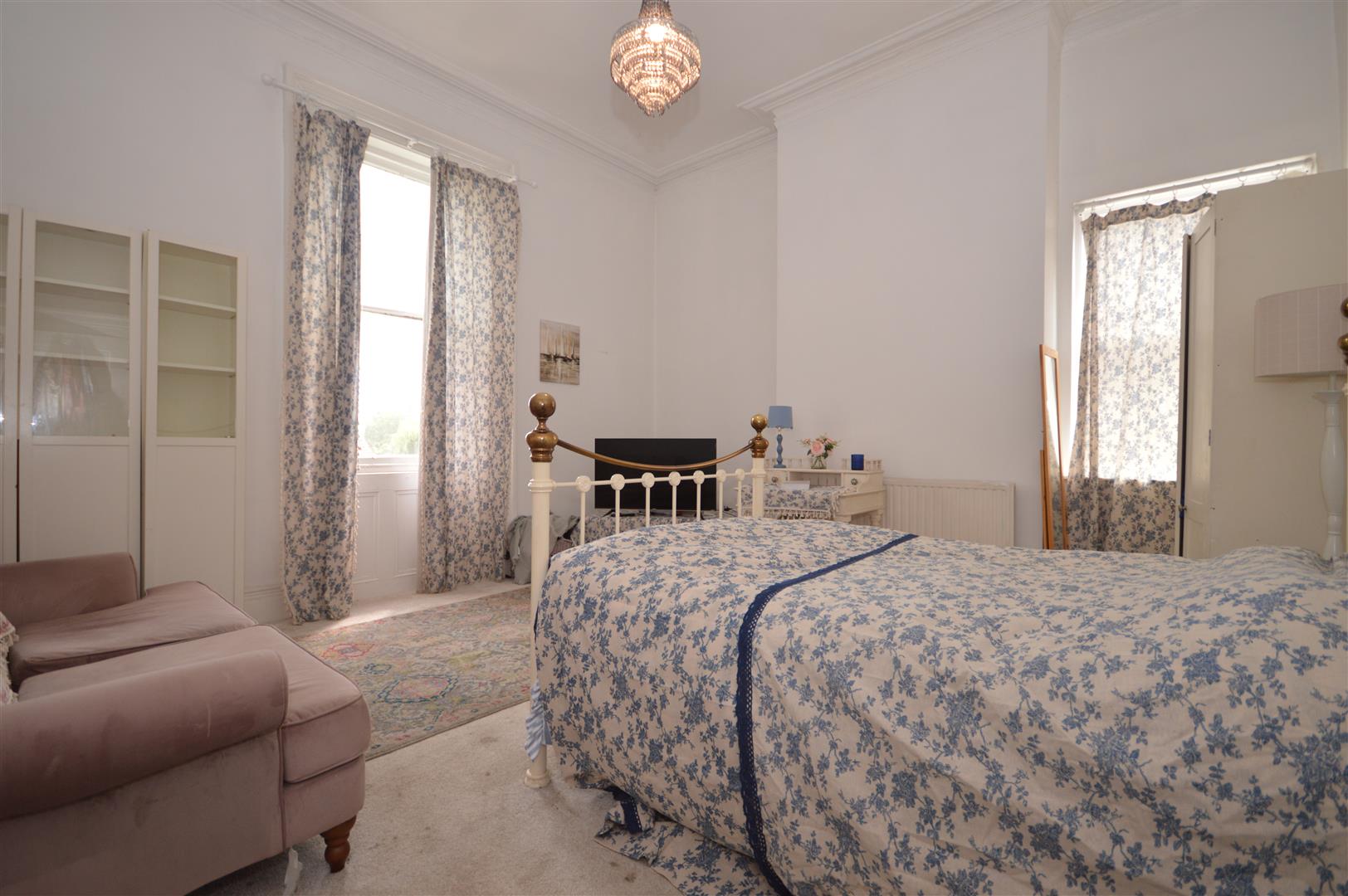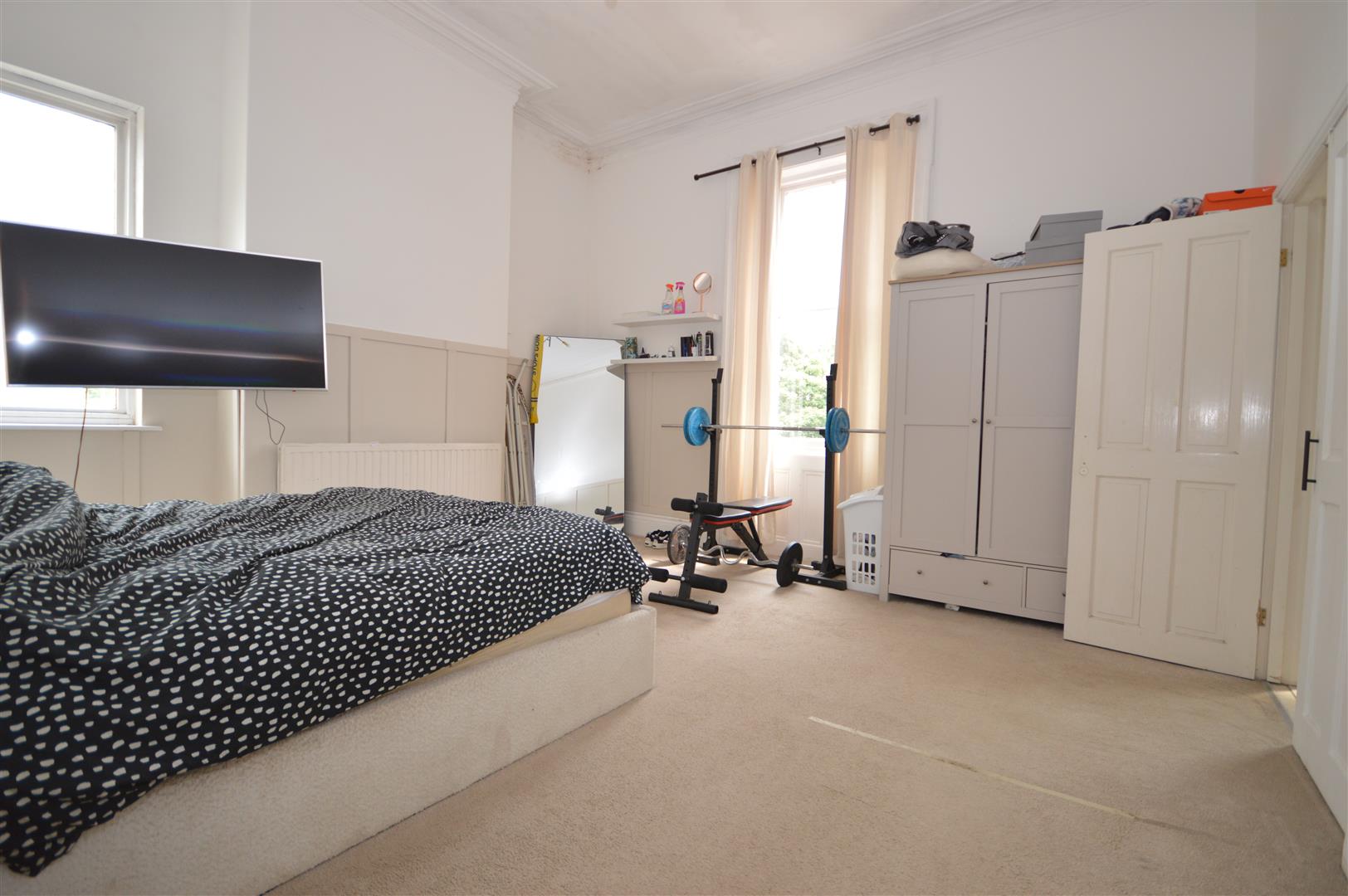 Principle Bedroom - A large room with panelled walls, two windows and double doors leading into a large en-suite.