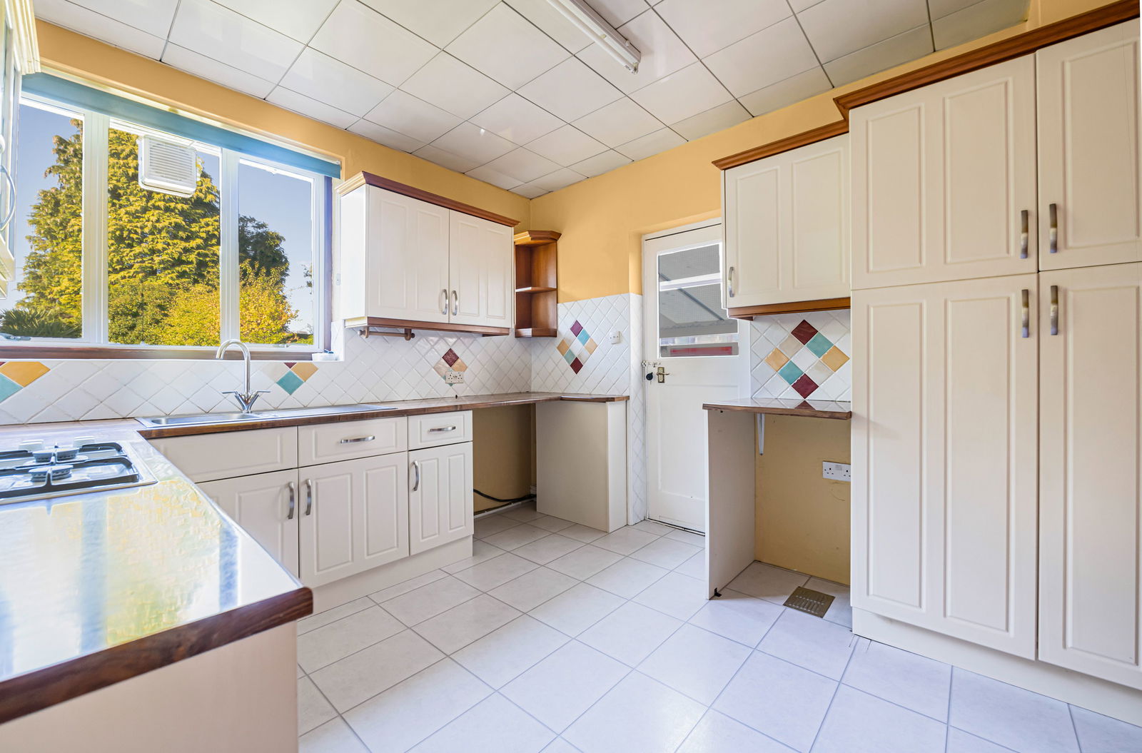 The property features two bedrooms on the ground floor and a third bedroom upstairs, providing flexible living space for families or those seeking a home office or guest room. The kitchen offers access to the attached garage, adding practical storage and potential for future development (subject to planning).