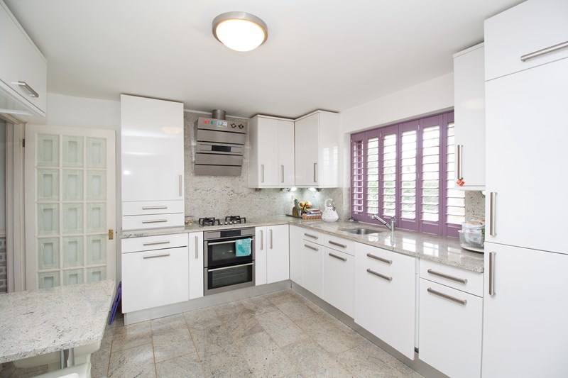 The kitchen Breakfast room opens out into a Dining section fitted with full length glazed doors opening onto the garden. The Kitchen has been comprehensively refitted with glossy white fronted kitchen units and polished granite working surfaces co-ordinated to a fitted breakfast table which matches the granite flooring. The worktops are illuminated by over counter lighting and incorporate the sink and fitted 4 ring gas burner. Further integrated appliances comprise an AEG double oven, stainless steel extraction unit and washer/dryer. The cupboards also incorporate a pull out ironing board and recycling bins. The dining area is delightful affording a triple aspect over the surrounding gardens with glimpses of the golf course.