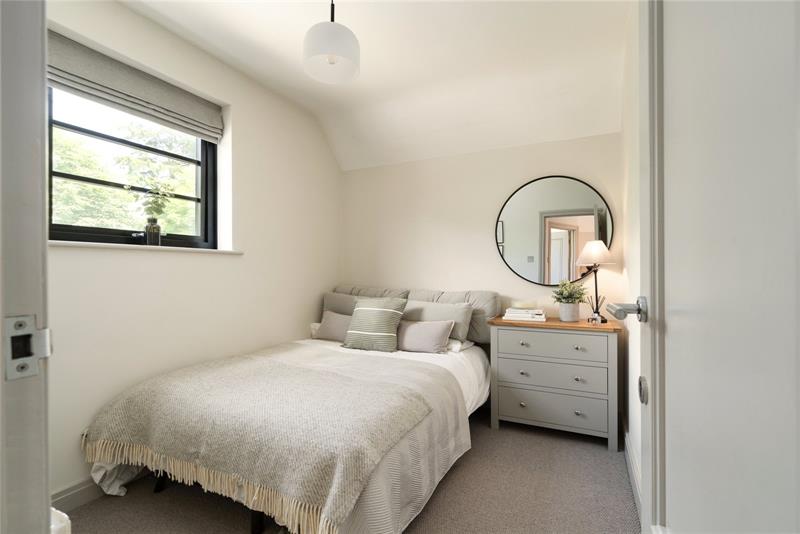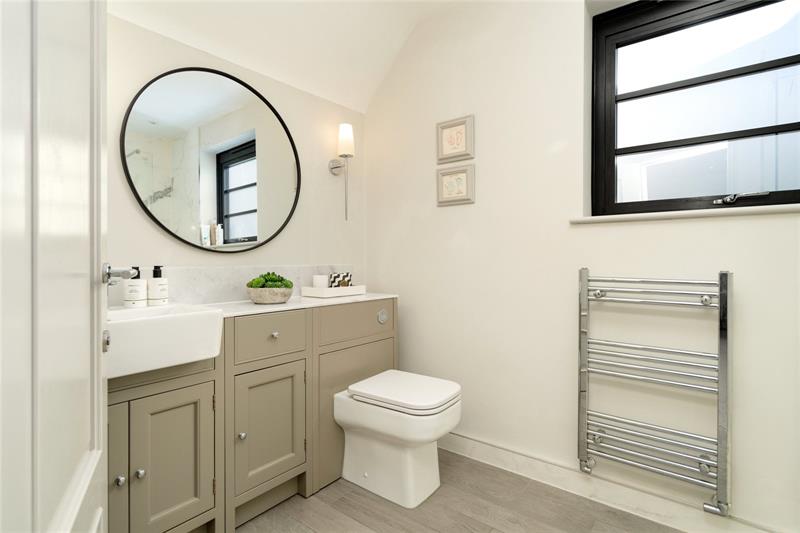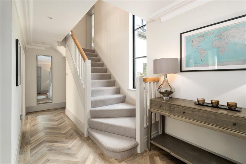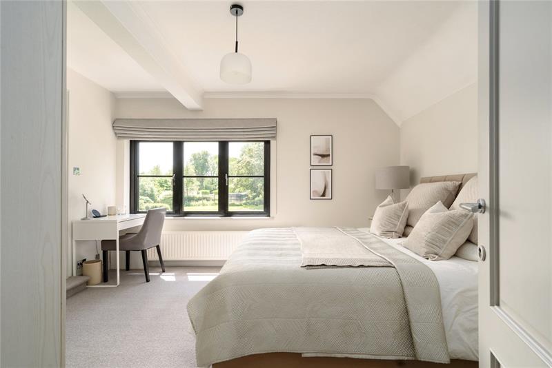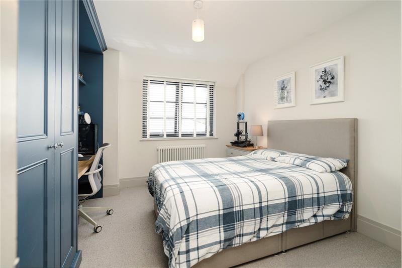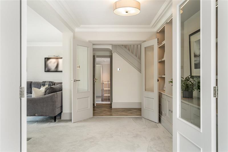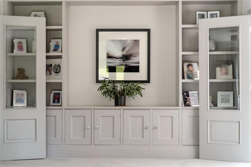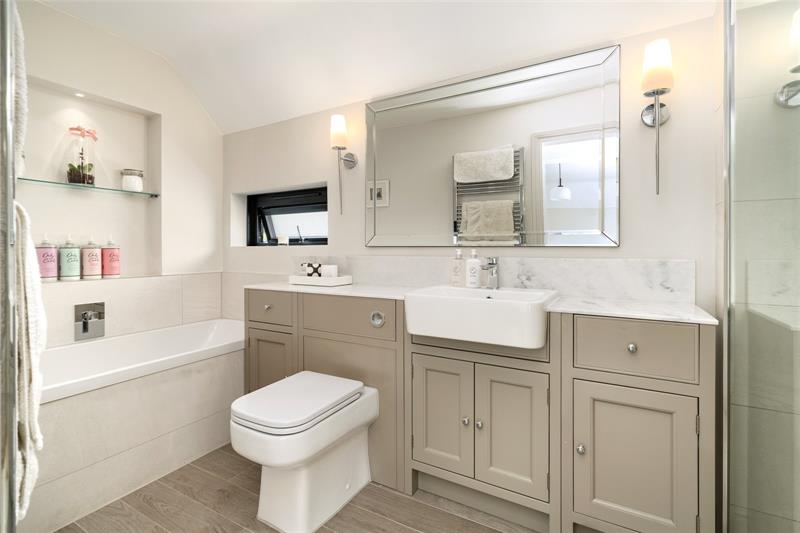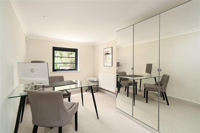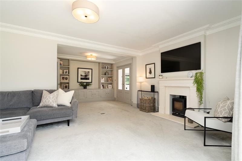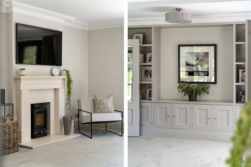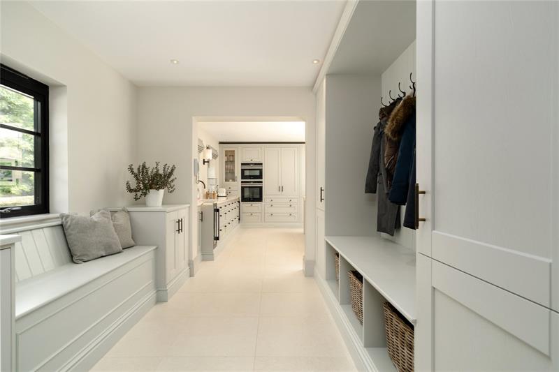 The Living Room features a newly fitted stone fireplace with a new log burner and lined flu, newly fitted carpet, French doors to the garden and a library area with bespoke joinery and LED lighting. From the hallway with Amtico and underfloor heating, there is a study benefiting from both front and rear aspects. The useful boot room is accessed from the hall and features built in furniture to include basket drawers, coat hooks and a window/bench seat with storage under. Here you will also find the space and plumbing for the integrated washing machine and tumble dryer.