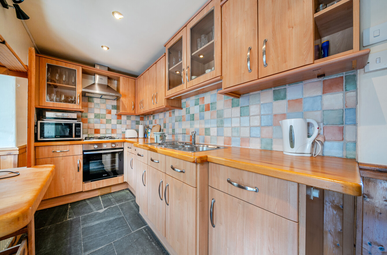Kitchen (15'1 x 5'9) with slate flagstone flooring, radiator. Base and wall cupboards to 2 walls with complimenting wood worktops, stainless steel sink unit inset. Integrated fridge, new electric oven, 4 ring gas hob with new extractor hood over. Pantry cupboard off (previously used as home office). Door to