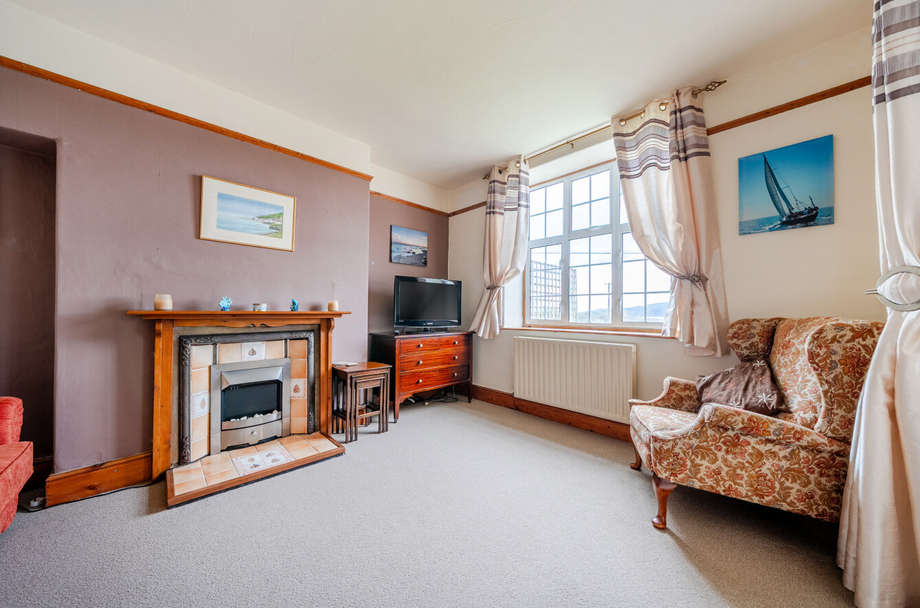 Living Room (11' x13'6) with electric fire set to tiled hearth and surround, radiator, deep picture window enjoying views over the Dyfi Valley and Estuary.