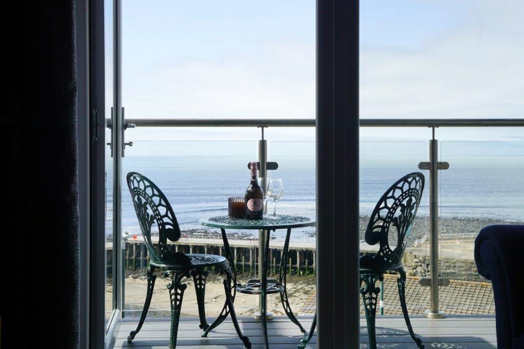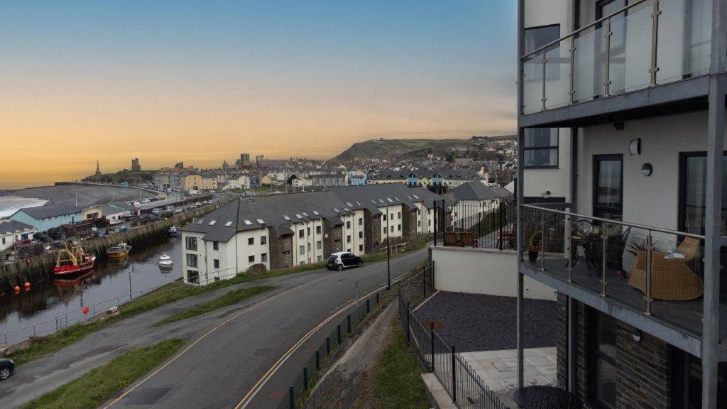 Open Plan Sitting Room/Kitchen; Sitting Room having a door to a glazed Balcony with quite stuning views over the Harbour and Aberystwyth south beach and further south into Cardigan Bay along the West Wales coastline. Kitchen area with an extensive range of base and eye level units, integrated oven and hob and washing machine.