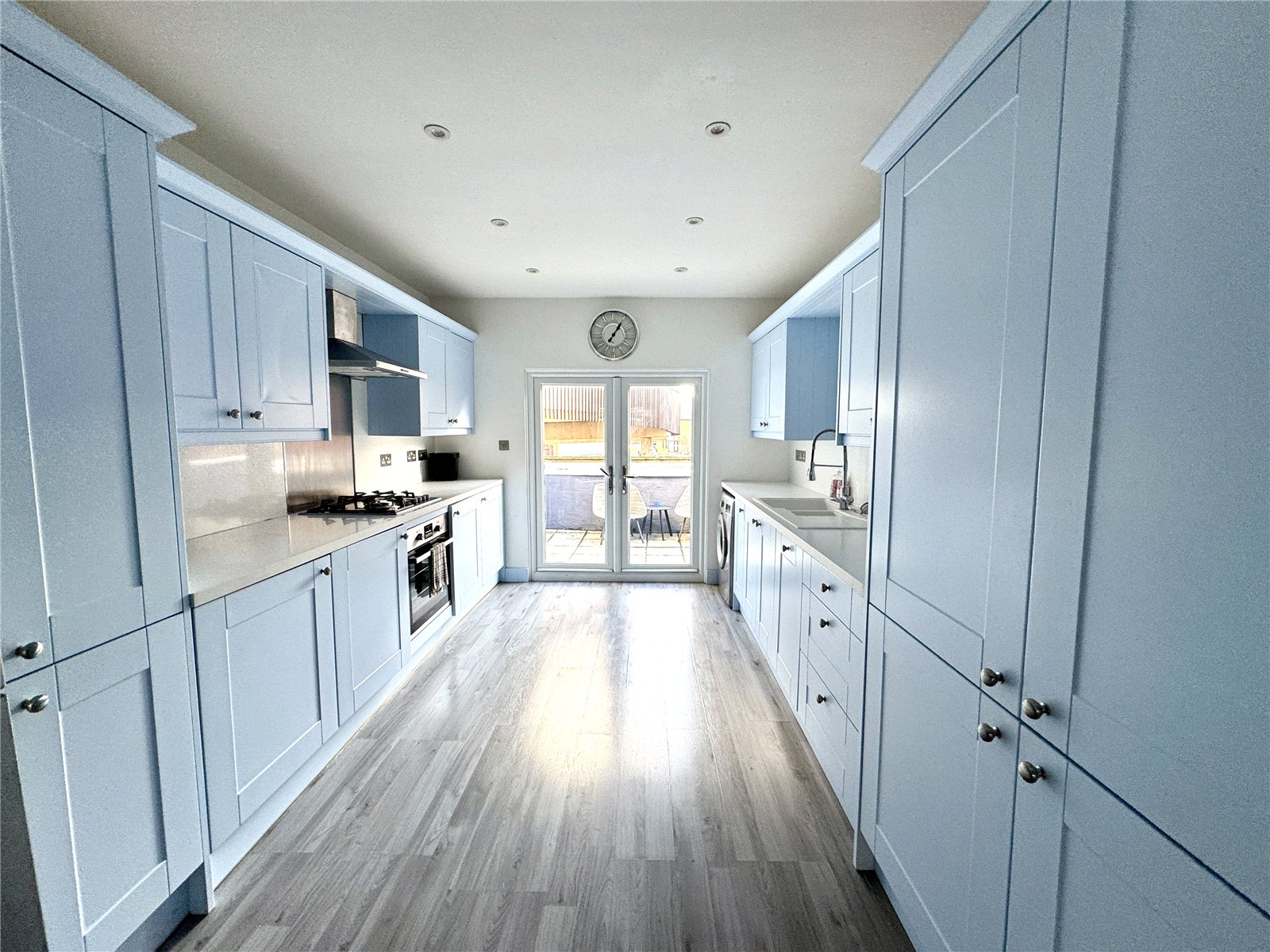 Kitchen with a range of fitted base and eye level units, electric oven, gas hob with stainless steel extractor hood over, 1.5 sink unit, plumbing for washing machine, laminate floor and French doors to rear yard.