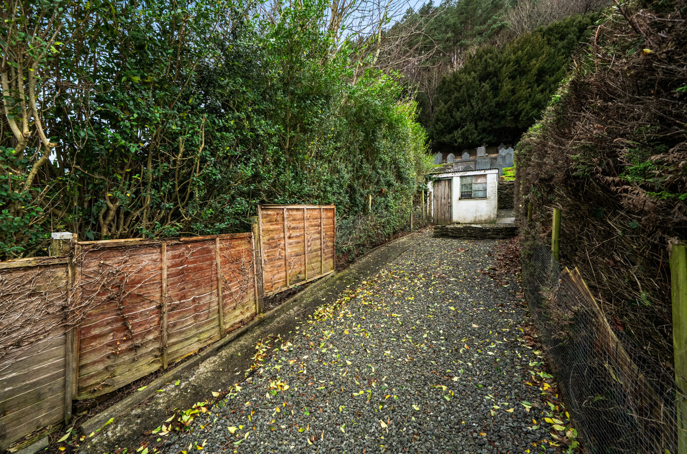 Forecourt garden. Steps through terraced garden, garden stores x 3, all within a hedgerow boundary.