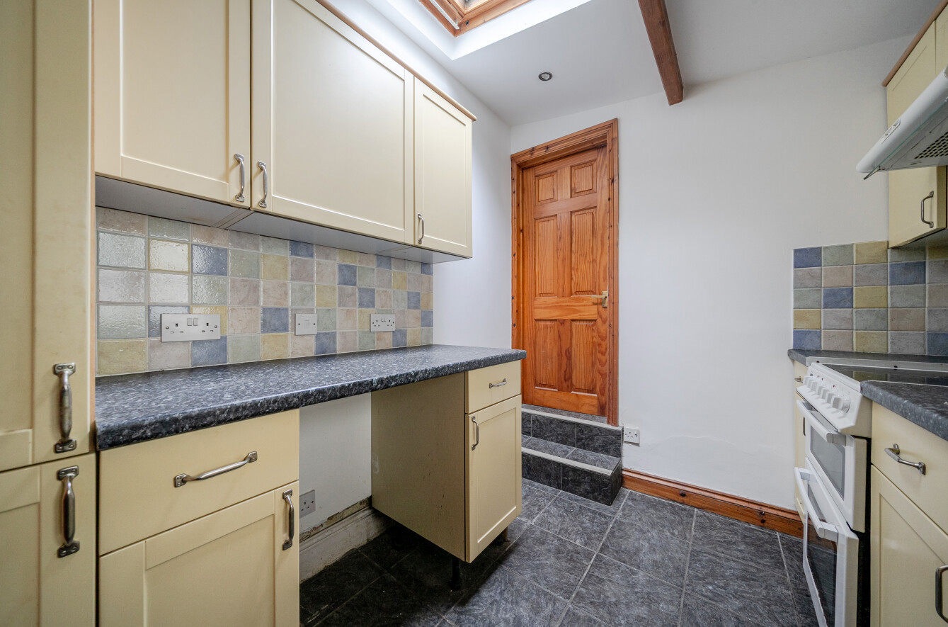 Kitchen with a range of base and eye level units, stainless steel sink unit, electric cooker point and space for fridge. Two steps to