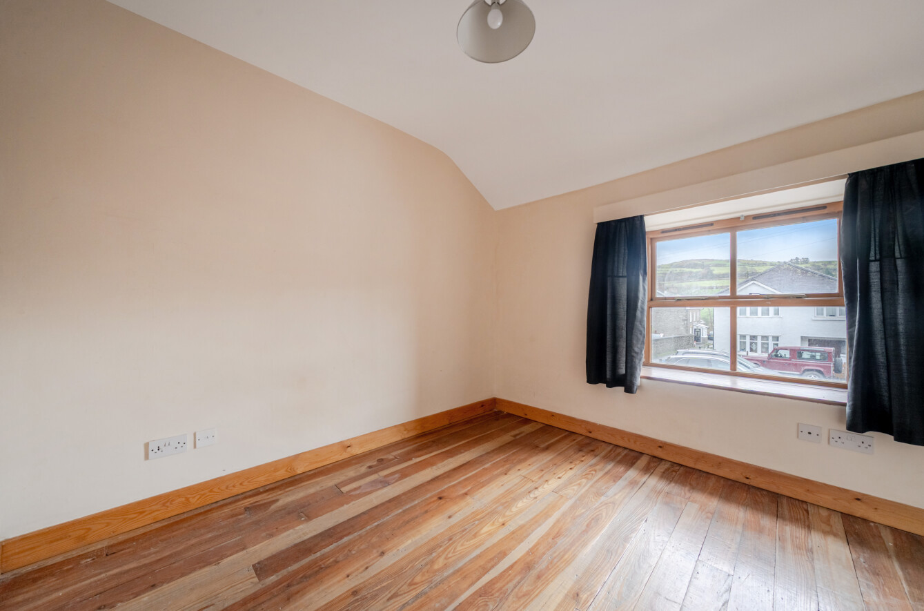Bedroom 2 with exposed pine floor and electric radiator.