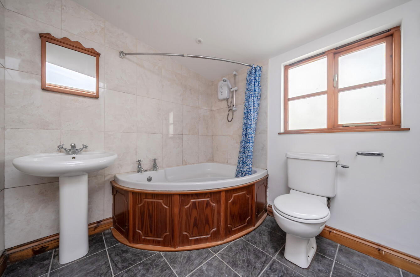 Bathroom with white suite comprising corner bath with electric shower over, pedestal wash basin, WC, tiled floor, electric heater and extractor fan.