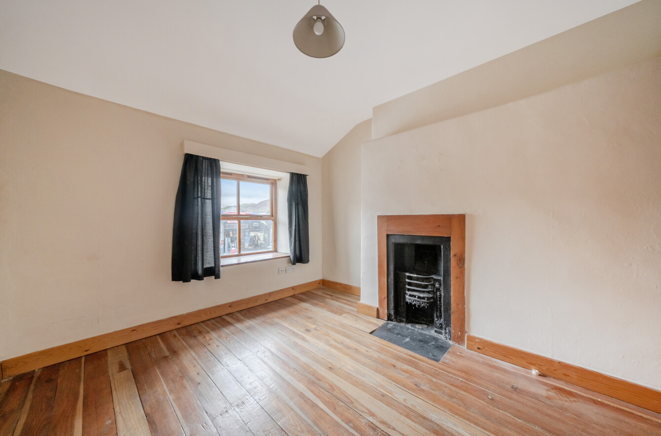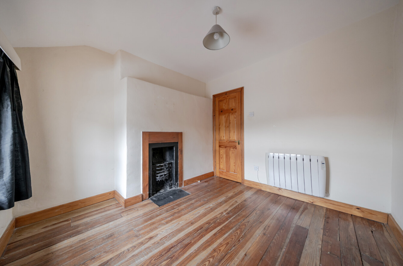Front Bedroom 1 with original fireplace, exposed pine floor, electric radiator and window to front.
