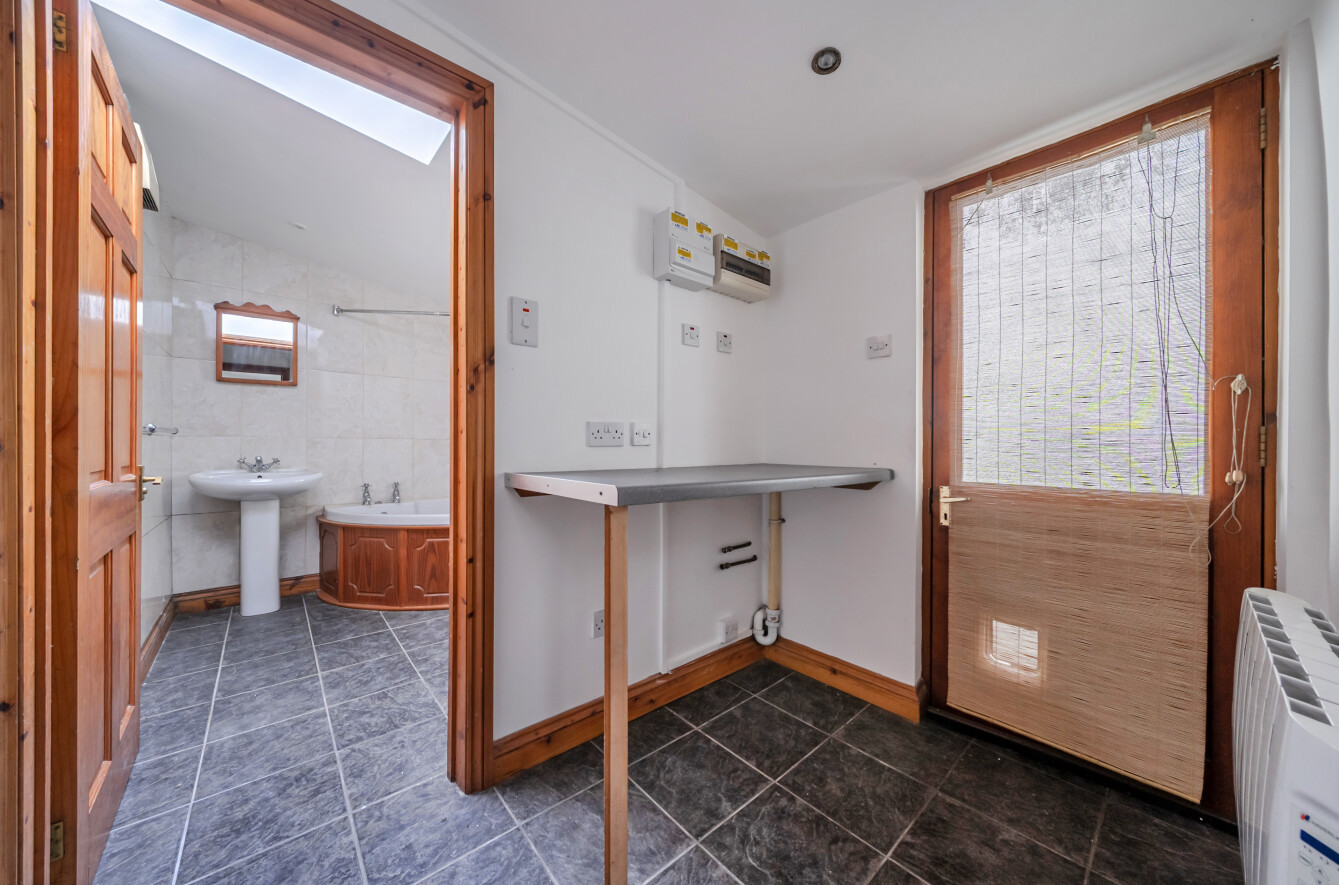 Utility Room/Rear Porch with electric heater, plumbing for washing machine, space for white goods and half glazed door to rear.