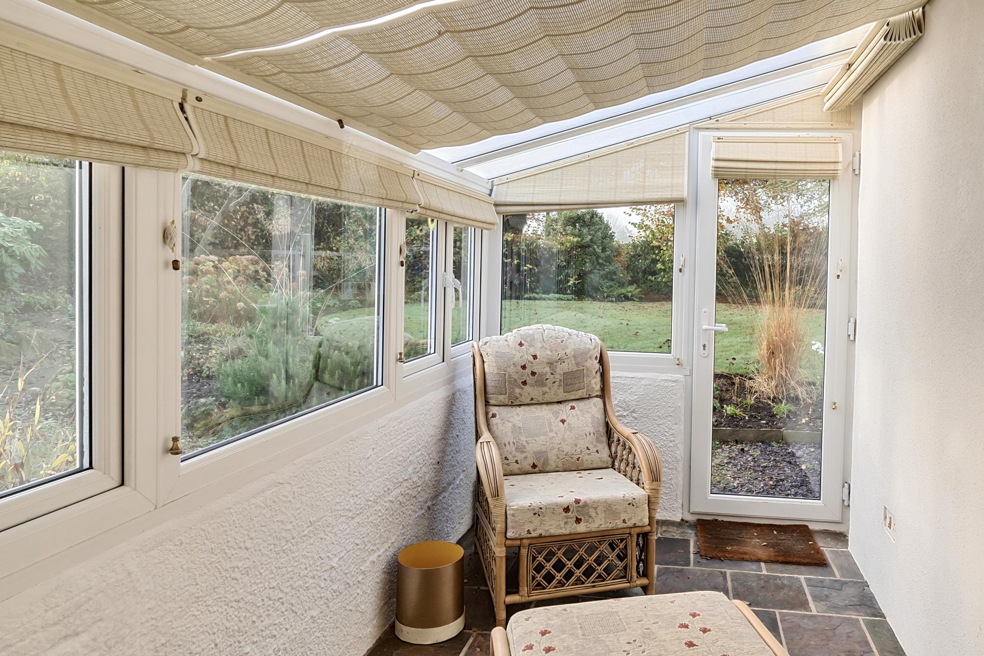The garden room, accessed externally, offers a superb views of the beautifully landscaped garden. With large windows on all sides, this bright and airy space is perfect for enjoying morning coffee, reading, or simply unwinding while surrounded by nature. The direct access to the garden makes it an ideal transitional space for indoor-outdoor living.