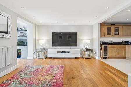 The ground floor boasts a bright and spacious open-plan living and dining area (5.54m x 3.71m & 5.13m x 3.63m) with bifolding doors opening out to the private garden — perfect for entertaining or enjoying peaceful evenings at home. The modern kitchen is well-equipped and benefits from units at both base and eye level allowing ample storage and surface space. The converted garage now provides a separate utility room and a dedicated study/family room, perfect for those working from home.