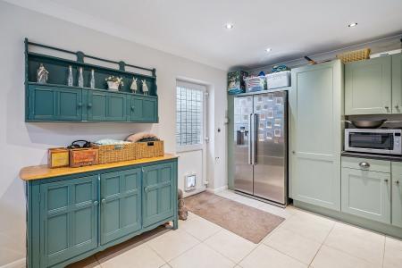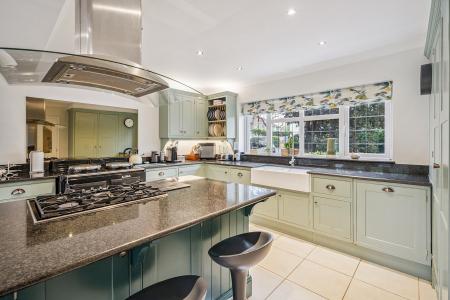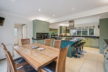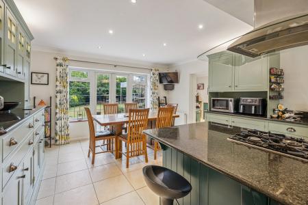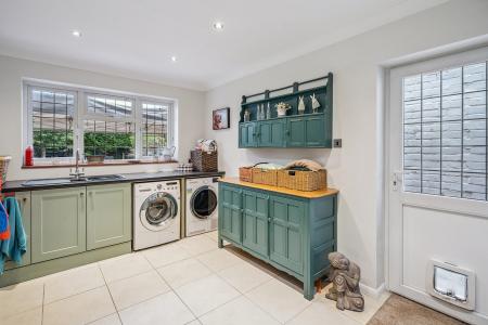 Upon arrival, a welcoming entrance hall sets the tone for the home’s exceptional interior, leading you into a generous living room filled with natural light from large windows, creating a warm and inviting space, ideal for relaxing with family or hosting guests. To the right of the hall, the stunning kitchen and breakfast room is undoubtedly the heart of the home. This beautifully designed space boasts expansive proportions, offering an abundance of room for cooking, dining, and socialising. The kitchen is fitted with high-quality units, sleek worktops, premium appliances, and a spacious central island that doubles as a breakfast bar, providing both style and practicality. French doors open from the kitchen to the garden, seamlessly connecting indoor and outdoor living, while a large adjoining utility room ensures laundry and household tasks remain discreetly out of sight.