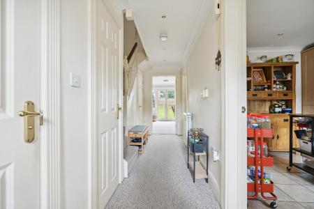 From the moment you step through the front door, the home feels warm and inviting. The spacious entrance hallway provides plenty of storage for busy family life, along with a convenient ground floor cloakroom. To the front of the property, the modern kitchen is both stylish and functional, featuring a range of fitted units and integrated appliances, making it an ideal space for preparing family meals while remaining connected to the rhythm of the home.