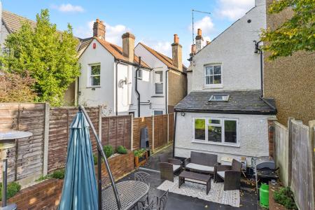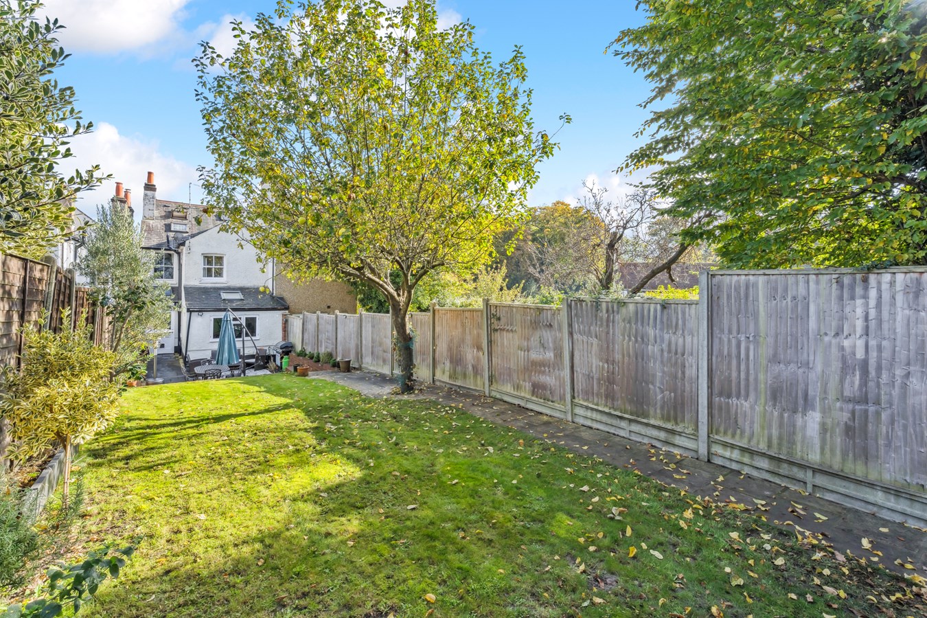 To the front of the property the garden is laid to lawn with a picket fence and gate leading onto Gold Hill Common. The rear garden has a large, paved patio area, with the main part of the garden laid to lawn with raised flower beds and access to the off street parking.