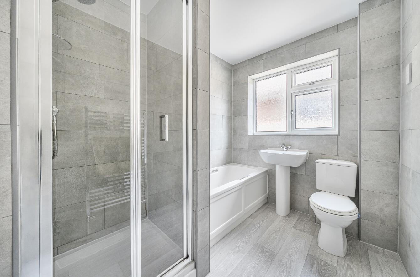 Bathroom: - Comprising shower in cubicle, bath, wash hand basin, WC, tiled walls.
