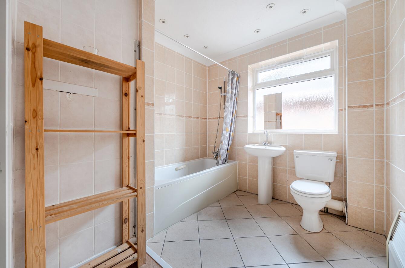 Bathroom: - Suite comprising bath with mixer tap and shower attachment, wash basin, WC, tiled walls and floor.