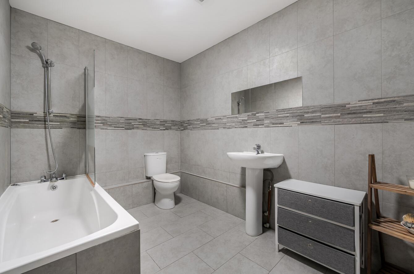 Bathroom: - Suite comprising bathroom mixer tap and shower attachment, wash basin, WC, tiled walls and floor.