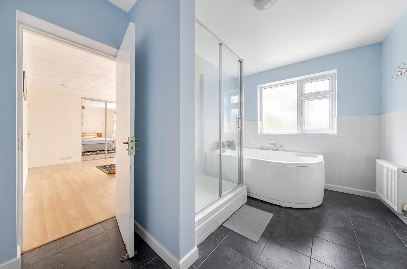 En-Suite Bathroom: - Suite comprising double person spa bath, separate shower cubicle with glazed screen, double wash basin with cupboards under, WC, tiled floor.