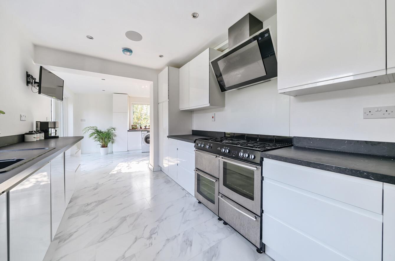 Kitchen: - 12'6" x 8'11" (3.81m x 2.72m) A range of re-fitted white gloss units, space for range style oven with extractor hood over, space for fridge freezer, integrated bins and dishwasher.